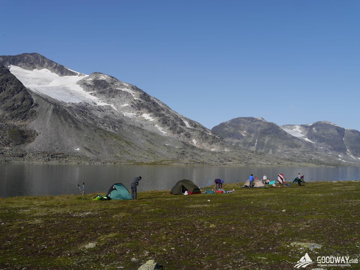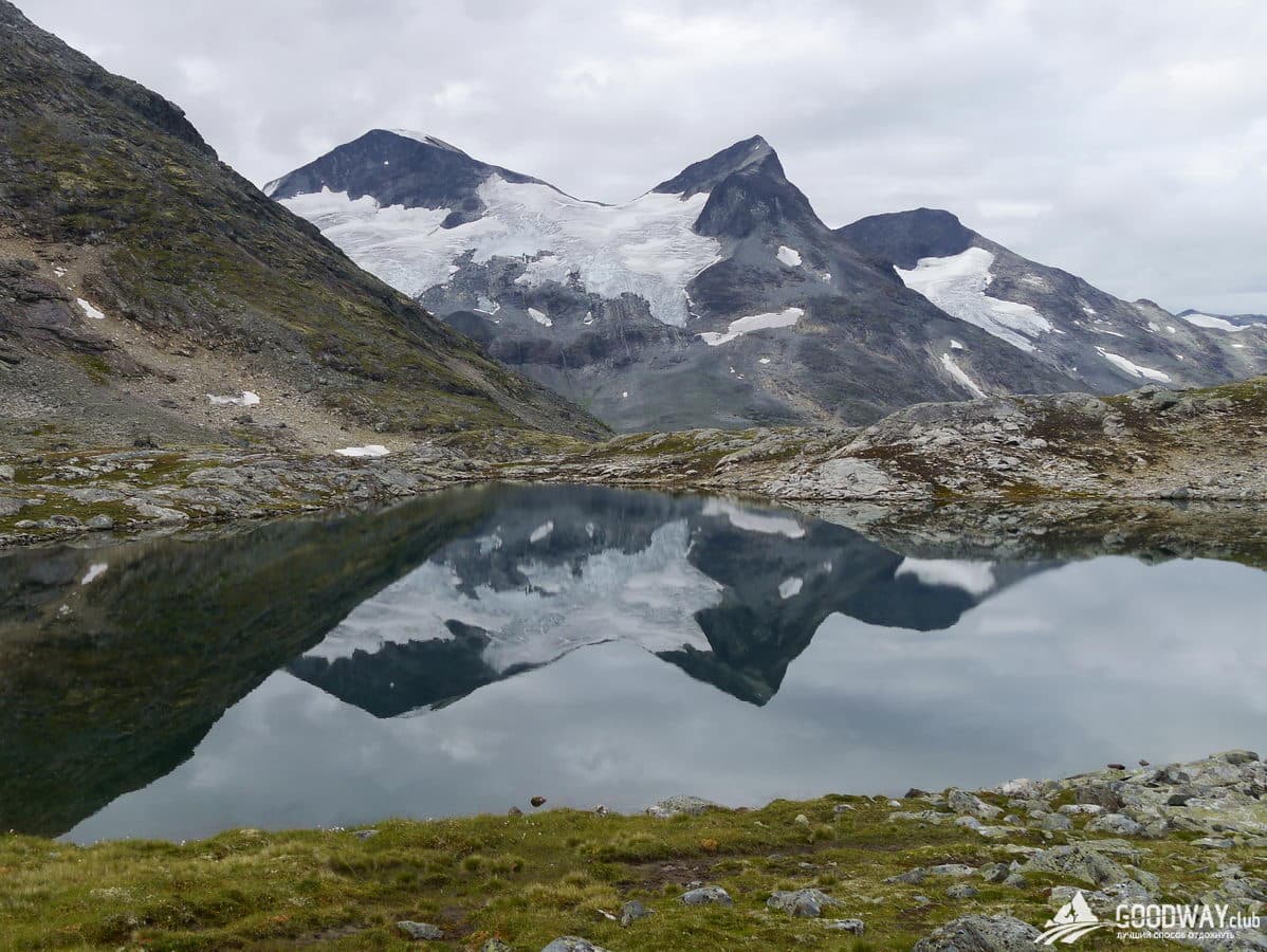 Продолжаем подъём вдоль рек. Пройдём два небольших озера и окажемся на перевале, откуда можно легко подняться на вершину горы Кирья. Желающие отправляются туда без рюкзаков, остальные отдыхают. Восхождение займёт часа три-четыре. После обеда переходим к озеру Лейрватнет. Это сердце парка Йотунхеймен, в воде отражаются окружающие нас заснеженные вершины. Особенно впечатляет знакомая Киркья. Отсюда её склоны смотрятся крутыми и неприступными.