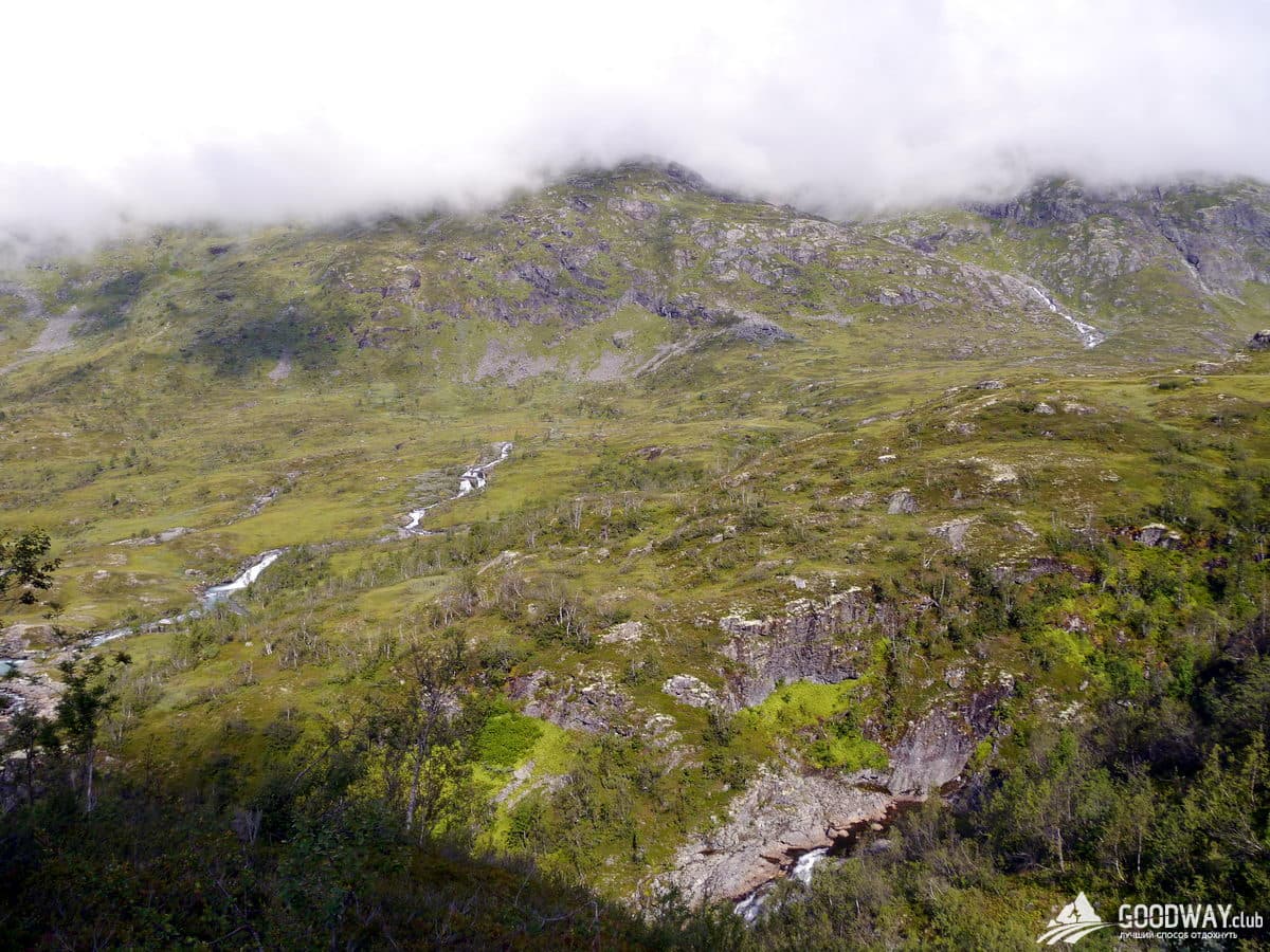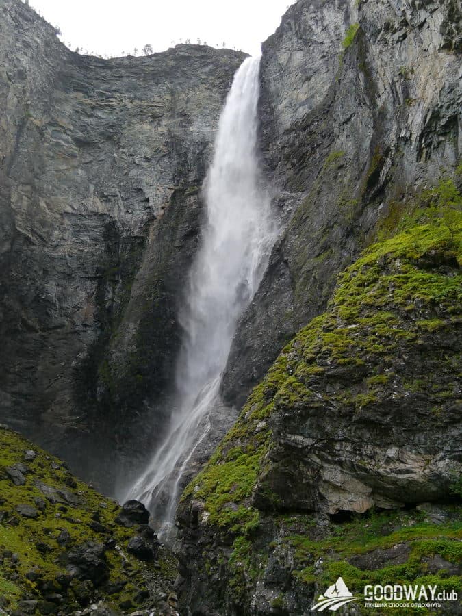 Снова заглянем на высокогорье. Нам никак не обойти перевал высотой 1270м. Оттуда спускаемся к дачному посёлку Веттисморки. Деревянные домики с травой на крыше выглядят ну просто умилительно! Далее идём к водопаду Веттисфоссен, самому великолепному в Норвегии. Да, есть тут водопады и выше и полноводнее, но этот самый красивый и впечатляющий! Высота свободного падения воды 270м! До земли струи уже не долетают, только водяная пыль. Целая река в миг разбивается в пыль и снова собирается в поток! Мощь водопада потрясающая. Виды тоже.