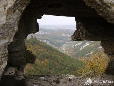 Проходим магазины в деревне, докупаем продовольствие при необходимости. Далее посещаем расположившуюся на обрыве мыса Куле-Бурун Сюйреньскую крепость-интересное оборонительное сооружение. На самом обрыве какой то древний художник высек в скале лица, видимо местных богов. Потом спустимся к пещерному монастырю Челтер-Коба, здесь хорошее благословенное и намоленное место. Так же есть святая купель с ледяной водой.