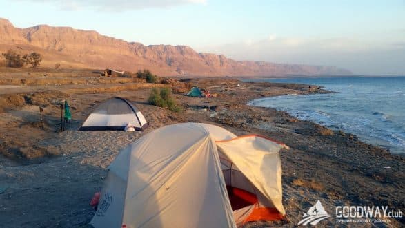 Ночуем уже ниже уровня моря, на «глубине» -140м. Хотя здесь это всё-таки «высота», поскольку вокруг горы, и дорога идёт дальше вниз. Просто, здесь своё море, Мёртвое, и высоту логичнее измерять относительно него, то есть прибавлять к абсолютной высоте 420м. Так что из -140 получится +280м, теперь уже точно высоты.
