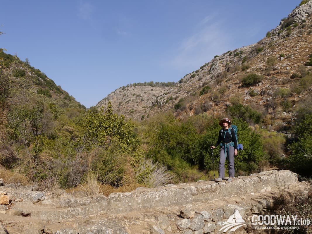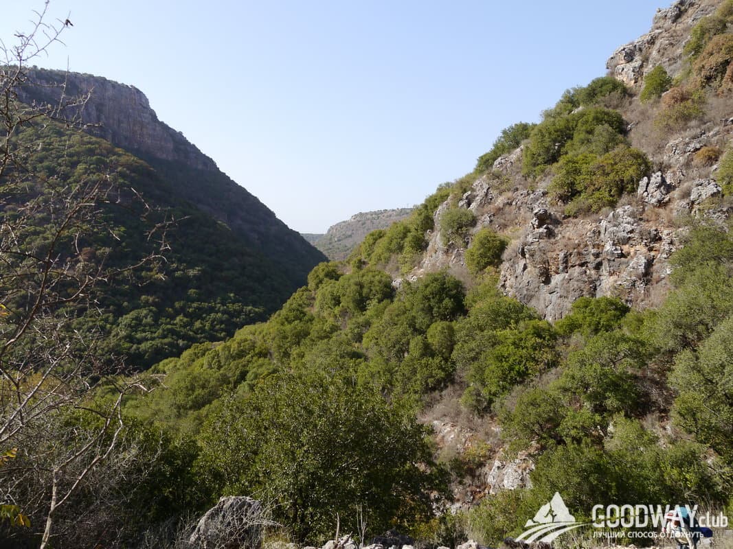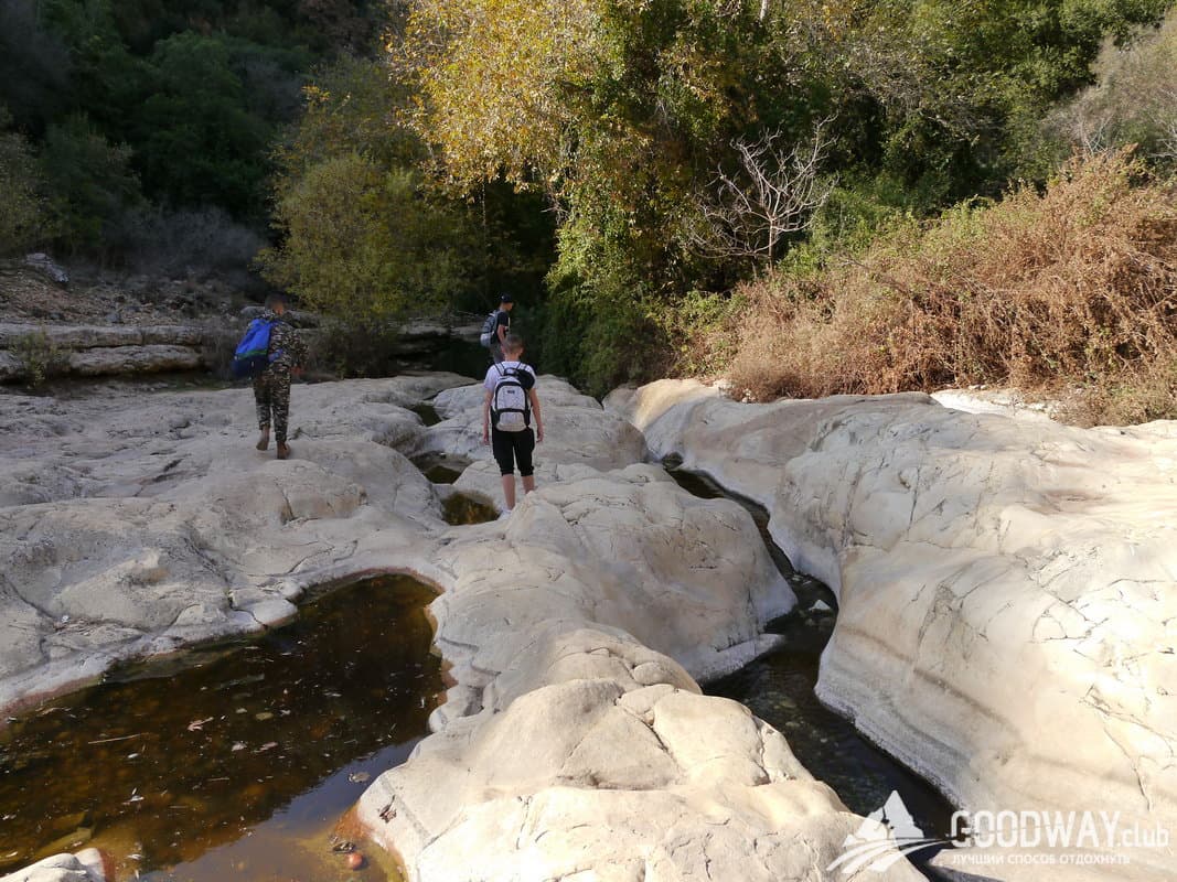 Входим в заповедник Нахаль Амуд. Поначалу это милый зелёный каньончик, с речкой и ваннами, можно покупаться. Здесь повсюду развалины водяных мельниц и акведуков времён Османской Империи. Они успешно работали здесь начиная с 16 века и до середины 20 века, когда их вытеснили электромоторы. Постепенно каньон сужается, становится непроходим по низу, тропа идёт наверх и вьётся по крутым склонам, открывая туристам прекрасные виды. Тропа узкая, часто приходится лезть по скалам. В особо опасных местах забиты металлические скобы, которые используются как поручни и ступени. Тут будет не скучно и живописно! А ещё это подготовка к каньонам иудейской пустыни, где ещё экстремальнее и живописнее!