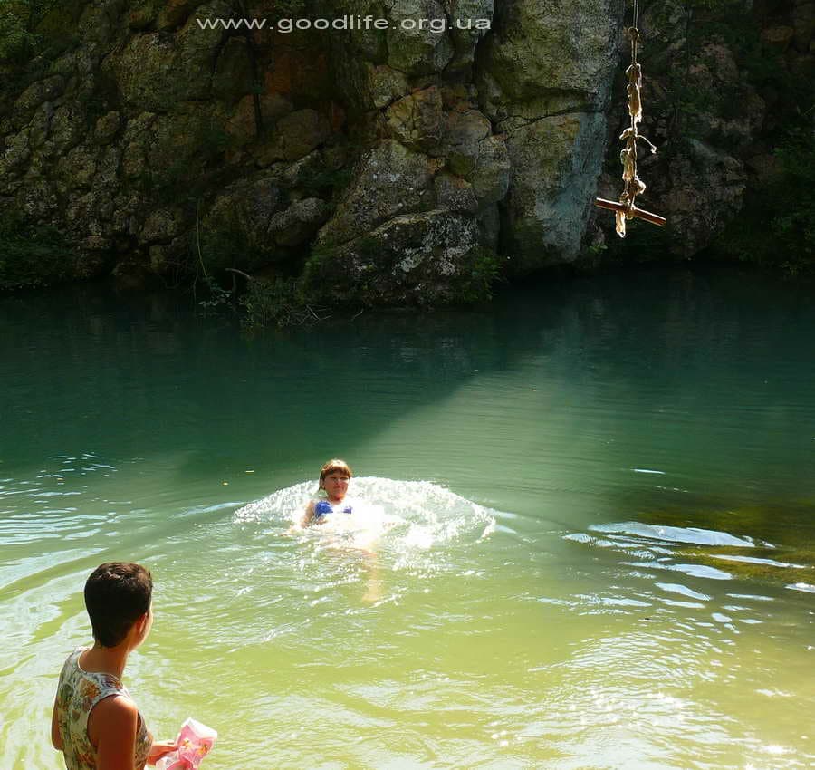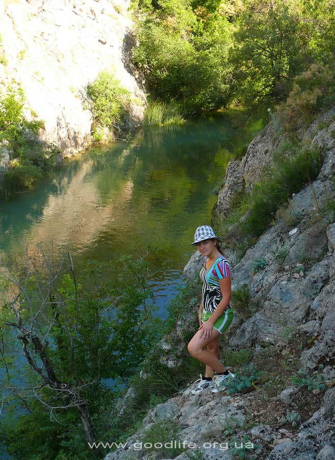 Идем, вокруг красота, лес, птички поют, всевозможные травы растут, для полного счастья только реки не хватает, очень искупаться хочется. И тут нам улыбнулось счастье. Вода! Ура! Вода! — воскликнула я. Это было озеро с тарзанкой, в Чернореченском каньоне.