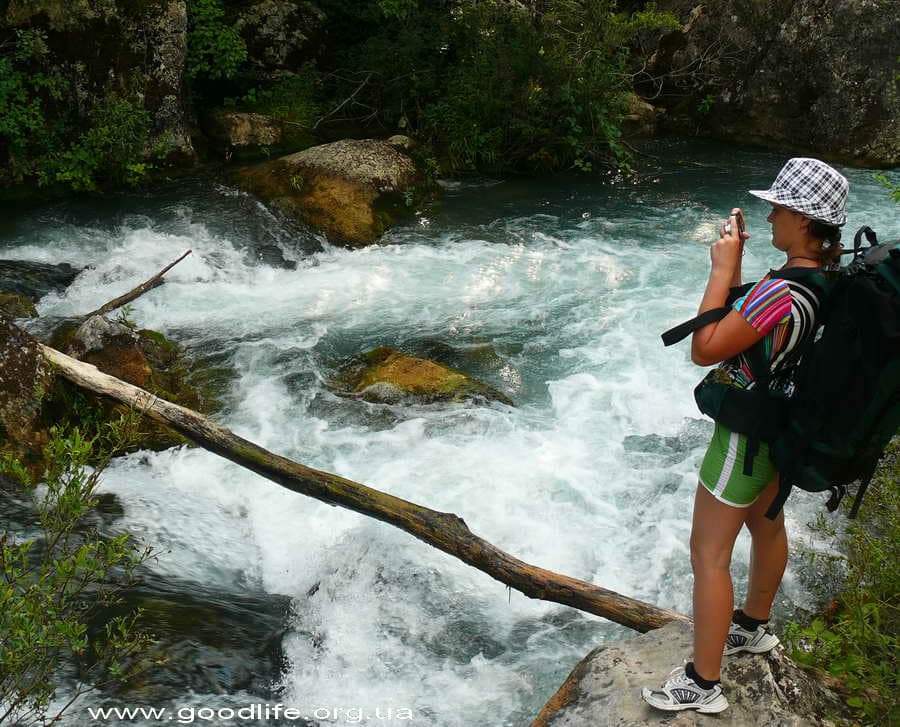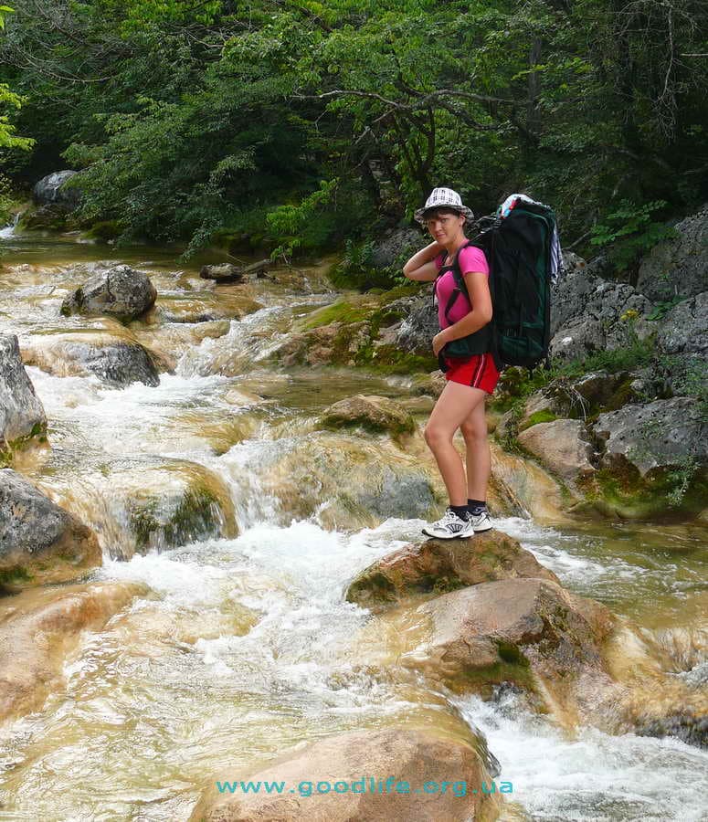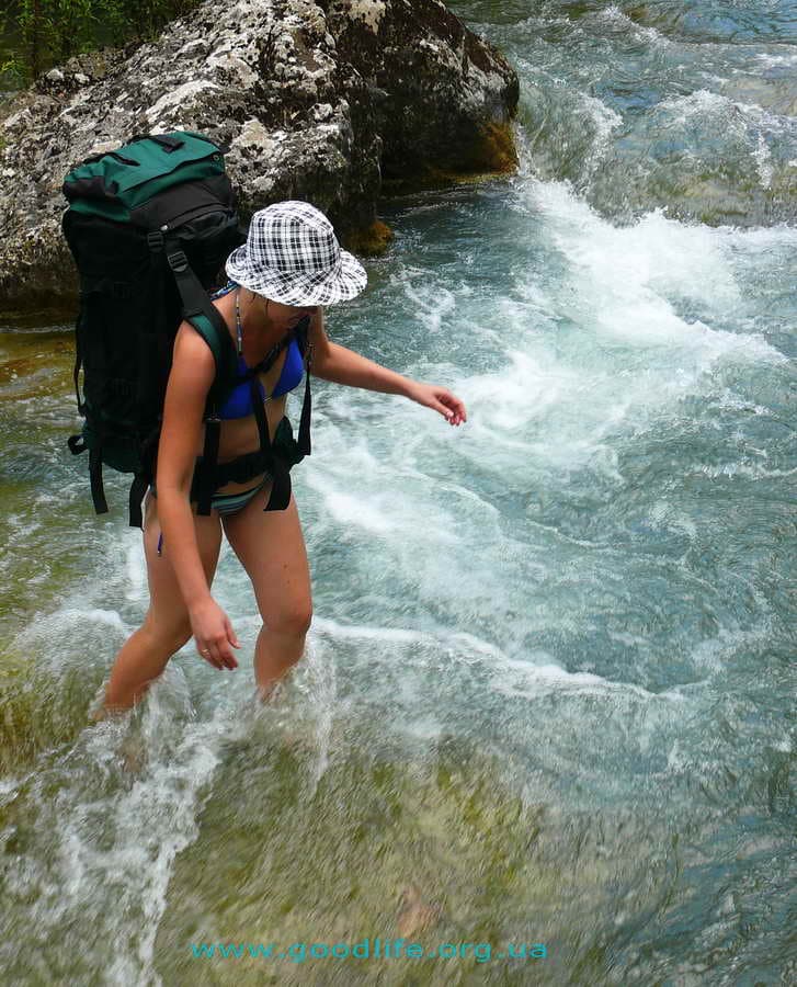 Получив достаточную дозу адреналина, мы успокоились и чуть выше этого места, где течение поменьше, вброд перешли реку. В купальниках, с рюкзаками на плечах. Это нужно было только видеть.