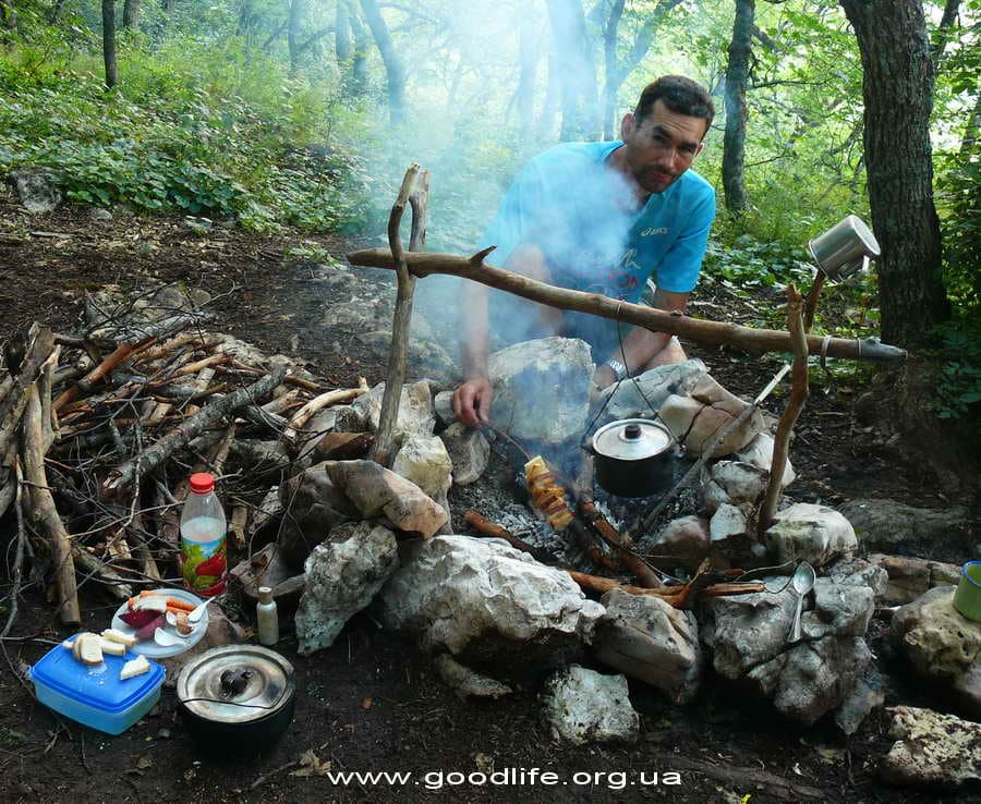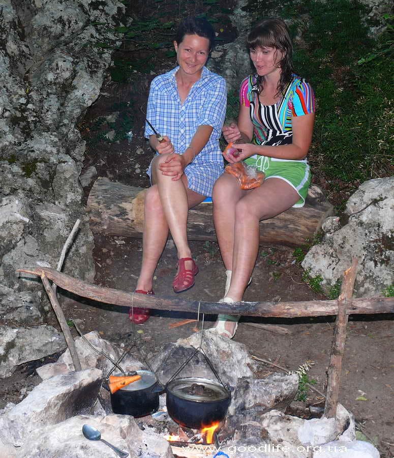 Поднявшись по каньону, мы оказались в красивом лесном массиве. Прогулка по нему привела нас на Барскую поляну, где остановились на ночлег. На стоянку пришли рано, и было достаточно времени для осмотра местности. Со скалы Орлиный залёт открывается безумно красивый вид на долину внизу. Вокруг горы, скалы, а ты сидишь высоко-высоко, почти наравне с облаками. Возле соседней скалы летает пара орлов, наверное, там расположено их гнездо. Я сижу на краю и мечтаю: «Вот бы расправить руки, как крылья, ощутить невесомость и взлететь». Так мечтая, мы любовались сначала орлами и обалденным видом на долину р. Бельбек, затем ошеломительно красивым закатом. Вода на стоянке добывается в ваннах пещеры Данильча-Коба. Помимо стандартного ужина сегодня ещё были «салбургеры» — кусочки сала и хлеба, запечённые как шашлык на углях.