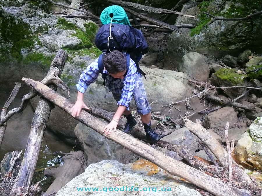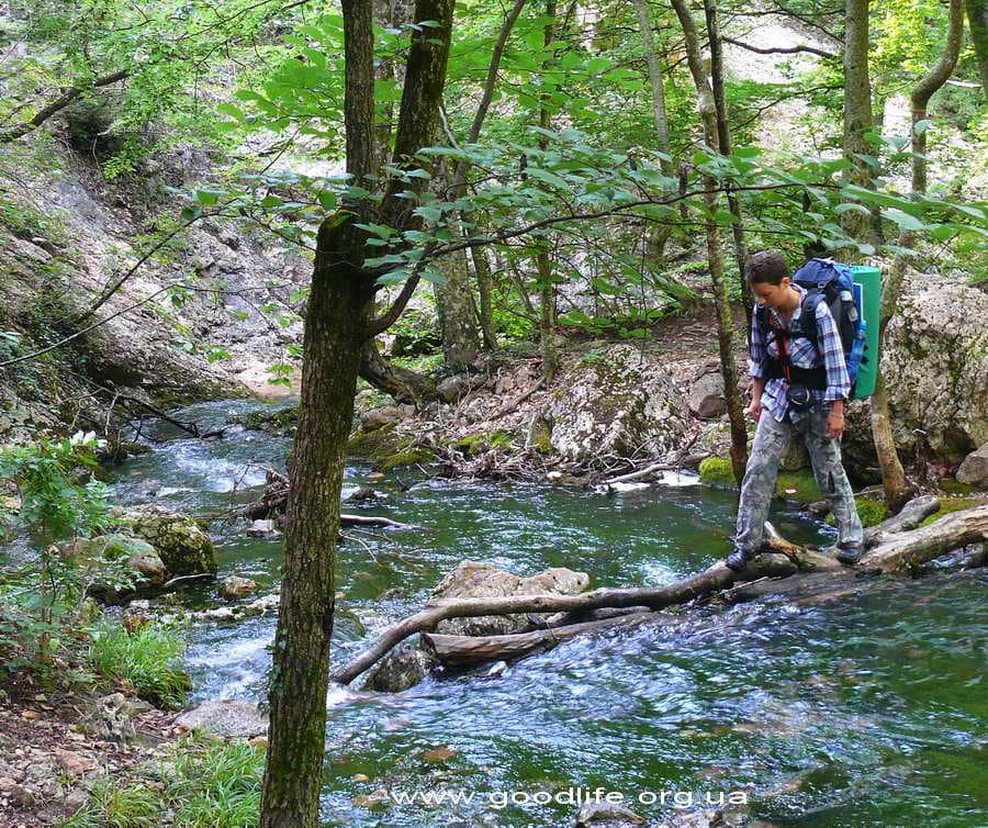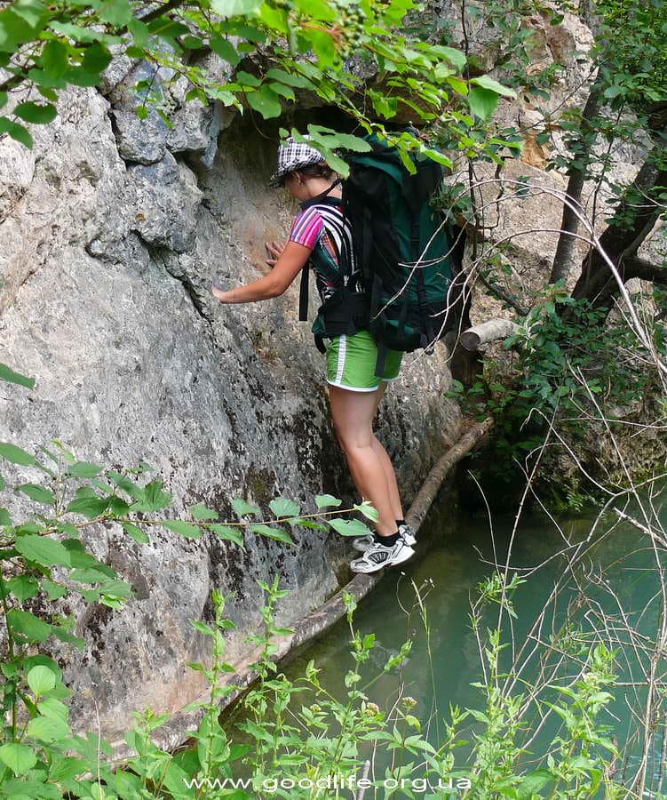 Идешь над водой по бревну, нужно держать равновесие, ведь на плечах рюкзак, а в нем вещи, спальник и совсем нет желания их намочить. Но несмотря ни на что удовольствия масса, радость от происходящего переполняет. Так мы шли, минуя одну стоянку за другой пока не созрело желание остановится на ночлег. Место очень красивое: глубокий каньон, высочайшие скалы, речка чистая, прохладная.