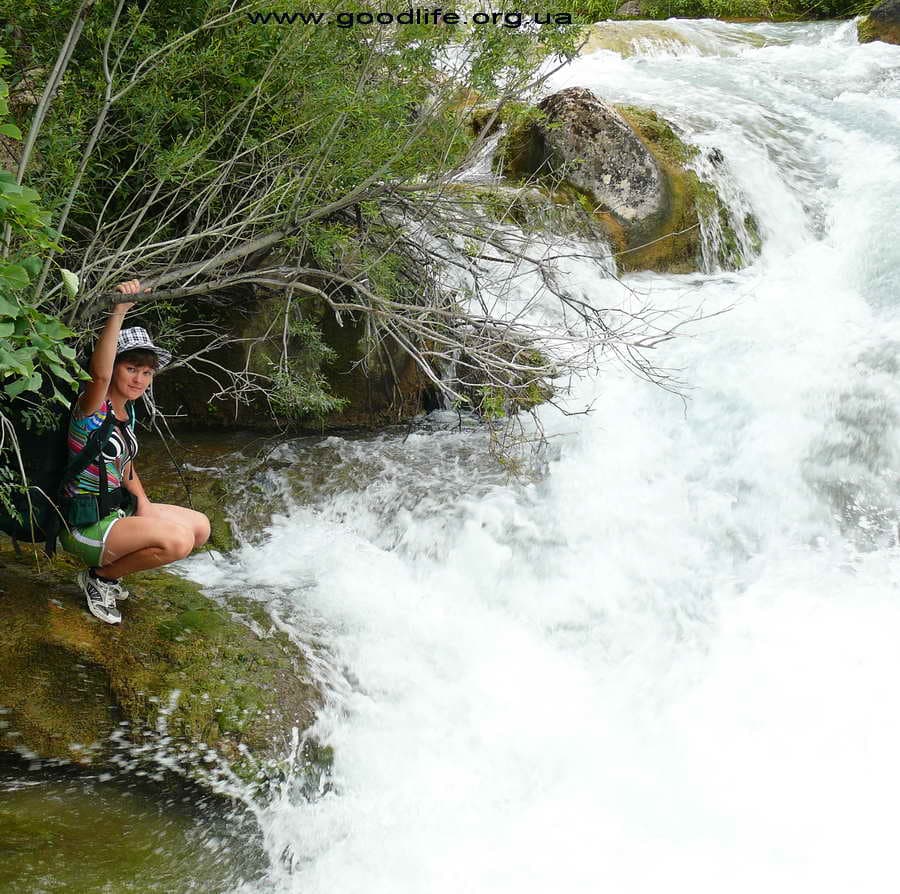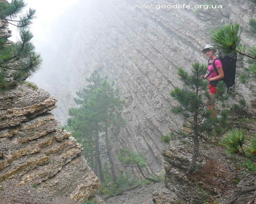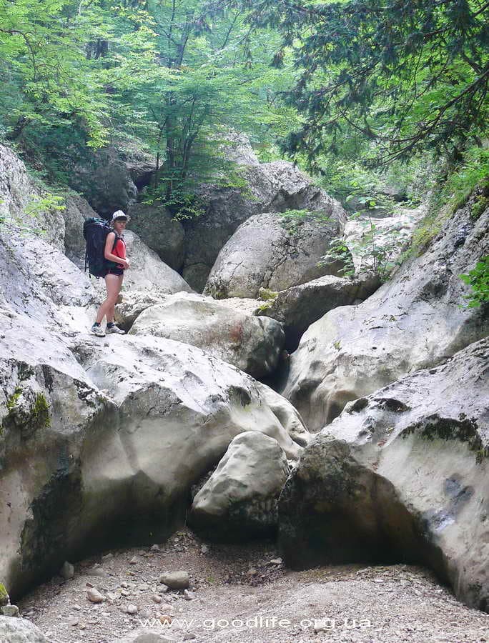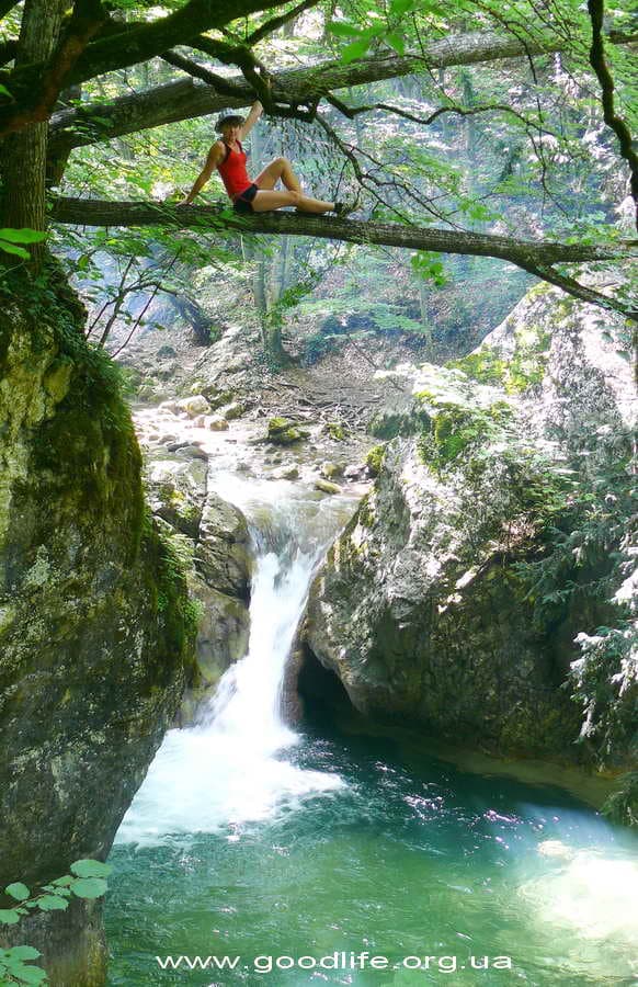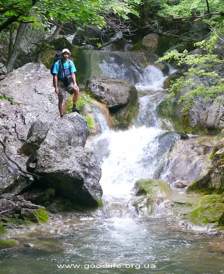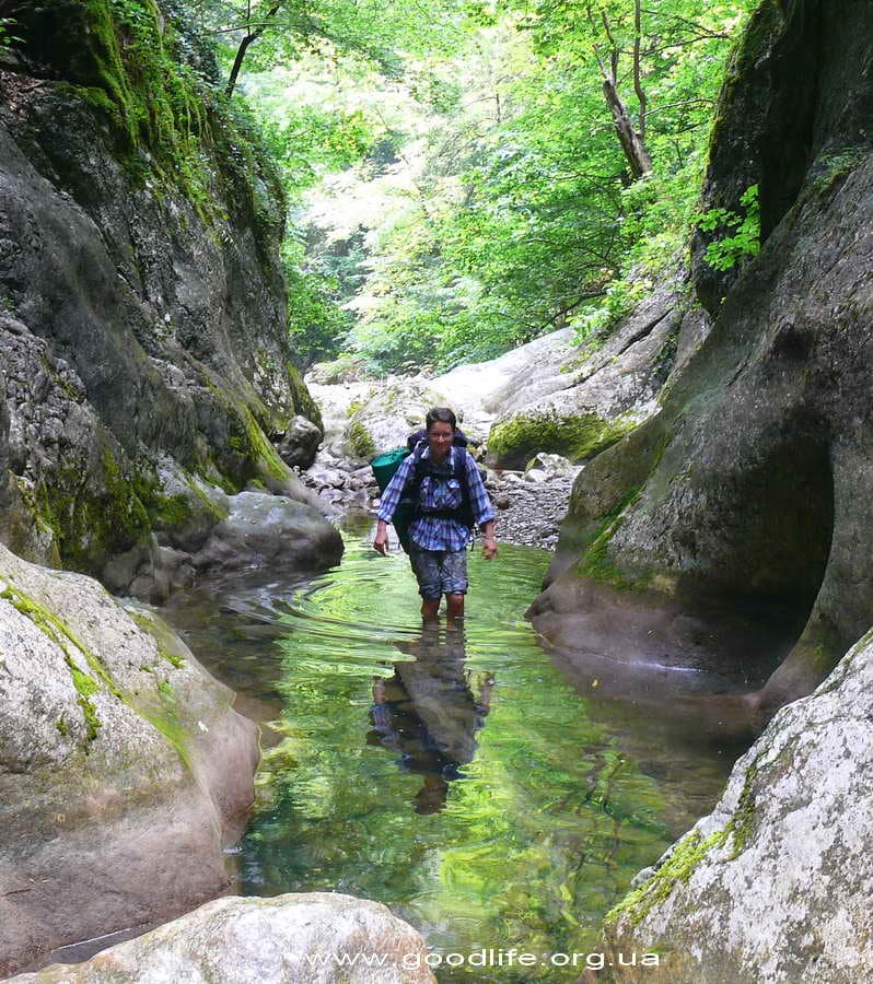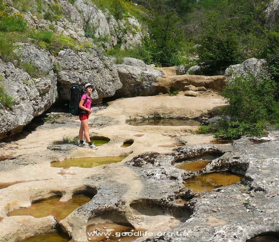 Большой каньон оставил глубокий отпечаток в моем сердце, очень хочется снова к нему. Мы шли по его берегам, любуясь перекатами, озерами и водопадами. У инструктора в голове созревала мысль пройти Большой каньон полностью, но встречные туристы убеждали, что это сейчас не возможно – много воды. Оставив Нателлу с рюкзаками, мы отправились за омоложением к Ванне молодости. «Понежившись» в ванне с водой в 10 градусов, решили разведать путь дальше по каньону. Прыгая по камням, двигались вверх. Прошли один источник, потом второй, и дальше от воды остался только след в ванночках. Решив попробовать пройти по дну каньона до конца, вернулись за Нателлой и рюкзаками. Наверное, самый красивый и неповторимый маршрут в Крыму проходит по дну Большого каньона (конечно, если откинуть участок от Голубого озера до Ванны молодости с толпами народа).
