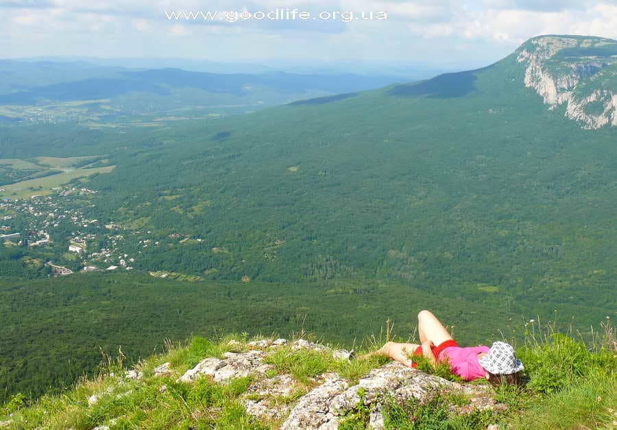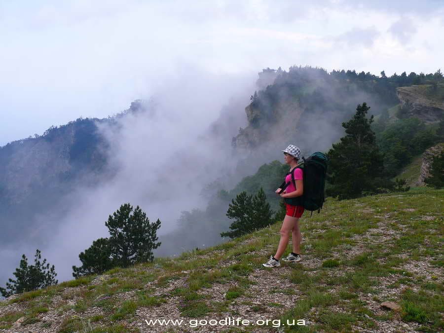 На следующий день с утра у нас была прилично долгая, монотонная, но не бесполезная прогулка вверх на Ай-Петринскую яйлу. Идя по ней, мы отведали земляники, инструктор собрал грибов к ужину. Когда шли уже по самой яйле, я пополнила коллекцию фотографий бабочек и растений. Дошли к месту, с которого открылся вид на Ялту и море. Это безумно красивый вид, тучи завладели всей долиной, Ялта еле просматривалась сквозь занавес, море и небо стали одним целым. Такой красотой хочется любоваться вечно.