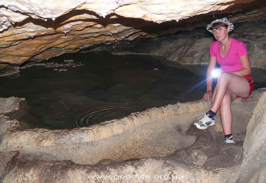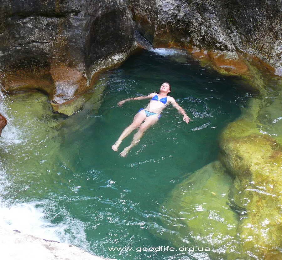 Только представьте себе: его глубина до 300 метров, а ширина русла местами до 2-х метров. Впереди неизвестность. Первой преградой на нашем пути стала ванна с водой, в которой была приличная глубина, нужно было перейти через нее по скользким бревнам. У меня не совсем удачно это получилось, немножко искупалась и намочила рюкзак, но настроение от этого не ухудшилось, а даже наоборот. Пройдя еще по нескольким ваннам вброд, думали, что дальше сухо и можно идти спокойно, но не тут то было. Дальше пошли одна ванна за другой. Некоторые проходили вброд, сначала босиком, затем уже в обуви, а некоторые приходилось обходить поверху, карабкаясь по скалам. Адреналин играет, любопытство переполняет, усталость не чувствуется. Бредем, плывем, карабкаемся и одновременно хочется, чтобы это скорее закончилось, и чтобы это длилось бесконечно!