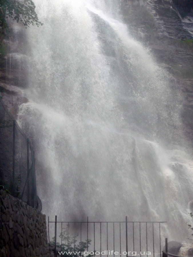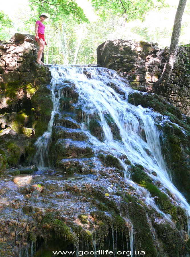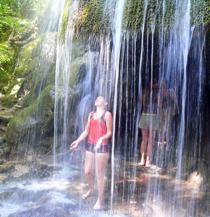 И тут начинается уже серьезный, но теплый дождь с грозой. Нас он не напугал, и мы продолжали спускаться, напевая все песенки о дождике, которые могли вспомнить. А какое удовольствие вернуться в детство прогуляться по лужам в обуви! Дождь закончился. Вода после ливня сошла с гор, и мы посетили самый высокий водопад Крыма — Учан-Су. Столько воды в нем бывает только весной.