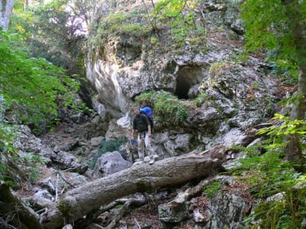На правом берегу (т.е. слева от нас) за камнями нашли узкую пещеру Водяная, еле протиснулись с фонариками: впечатления сильные.