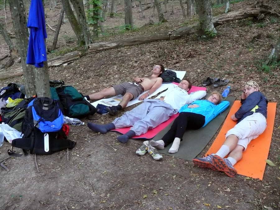 Утро второго дня для меня и двоих новичков (Наташи и Аркадия) было неахти. Тело деревянное, сил нет вообще. Еле выполз из палатки. Именно выполз, поскольку встал только держась за дерево. В туалет чуть спустился в балку, обратно карабкался на четырёх, долго и нудно. Зарядку сделать и мыслей не было. Однако, остальные четверо чувствовали себя отлично, Паша с Любой даже позанимались йогой, а Андрей и Дима устроили спарринг по Айки-до. Мне было всё равнодушно, ни сил, ни энергии в себе я не чувствовал. Но делать нечего – надо вести группу дальше, и кроме меня это сделать некому. Огромных усилий стоило собрать лагерь и двинуться вперёд. Глянул на часы и не поверил: 8 утра. Обычно утром удаётся выйти не раньше 9-ти. Сказалась экономия времени на завтраке. Сразу начался подъём. Наверно, медленнее меня движется только улитка. Вместо правила «Инструктора не обгонять» пришлось ввести «Держать инструктора в поле зрения, на развилках ждать», поскольку не обогнать улитку невозможно. Однако примерно через полчаса пути уже стало гораздо легче, а через час уже все трое отстающих пришли в норму. Конечно, слабость ощущалась всё равно, но ноги шли довольно быстро. Наташа подобрала очень точное определение – «ноги идут сами». Ведь силы в ногах не чувствовалось, и казалось, что они идут сами.