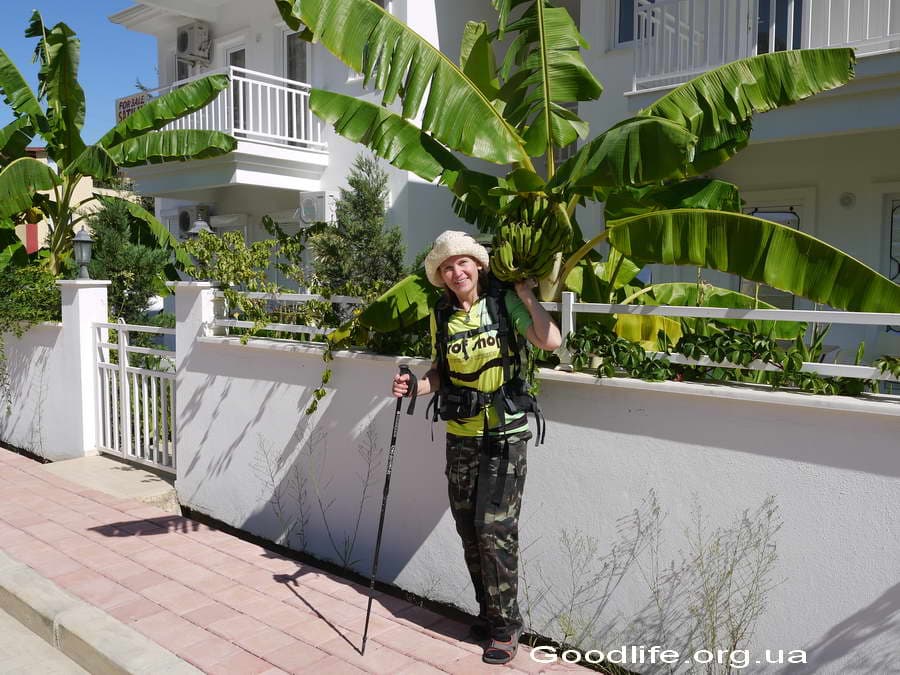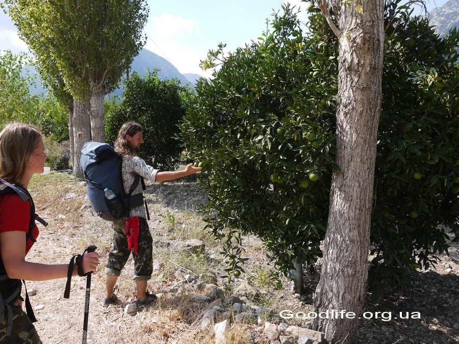 Дальше подъём через лес в деревню Яйлакуздере, на высоту 900м (такие привычные крымские названия попадаются, аж приятно). Тропа из леса упирается прямо в чей-то огороженный участок с домом. Но… в изгороди сделана калитка, и маркер тропы стоит прямо на калитке!!! Делать нечего-открываем калитку и идём через чей-то двор. Хозяев не было. Женя рассказал, что в марте калитка была на замке, но через забор были перекинуты лесенки для людей. Вот это да! Нет слов… Деревня Яйлакуздере отличилась ещё изобилием спелого инжира. А под деревьями можно было собирать уже подсушенный – особое лакомство. С цитрусовыми в этом походе нам не повезло: в Турции они дают 2 урожая – в марте-апреле и ноябре-декабре. Так что мы только могли грустно смотреть на зелёные апельсины, мандарины и лимоны, также растущие прямо на улицах.