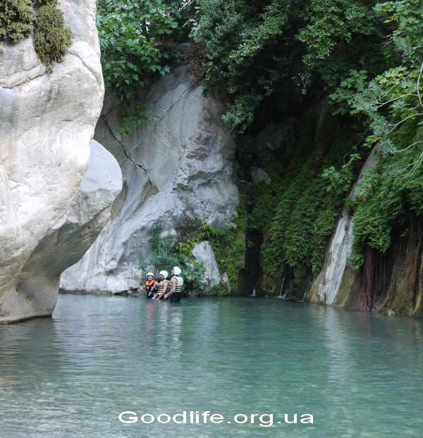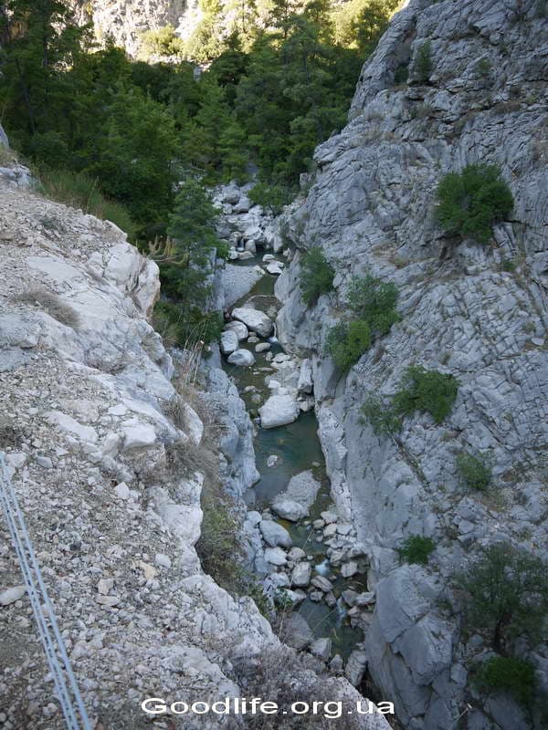 Идёшь и чувствуешь себя в другом мире. Да, это действительно совсем другой мир. Хотелось сразу покупаться, но горы манили ещё больше, да и пройти хотелось побольше. Так что мы поворачиваемся к морю спиной и берём курс на разлом в горном хребте – каньон Гёйнюк. Там национальный парк и вход по 5 лир. 4-х километровая обустроенная тропа по каньону изобилует прекрасными видами, и выводит к узкому месту, полностью залитому водой.