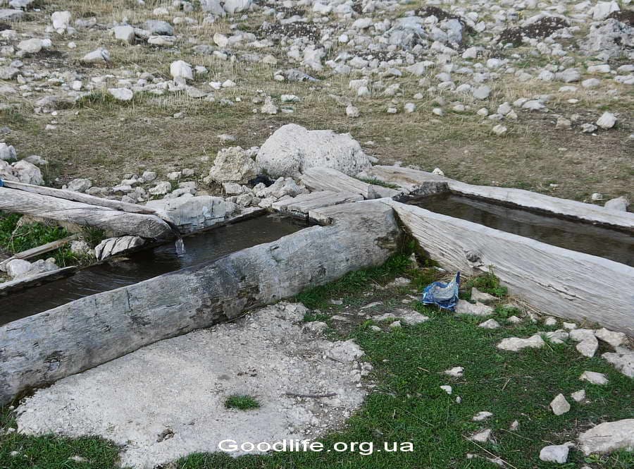 Ещё чуть дальше открылась огромная совсем плоская поляна с источниками и домиком пастуха. Поилки для животных и желоба для подачи воды были сделаны из цельных стоволов деревьев, как и 2000 лет назад.