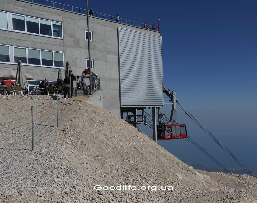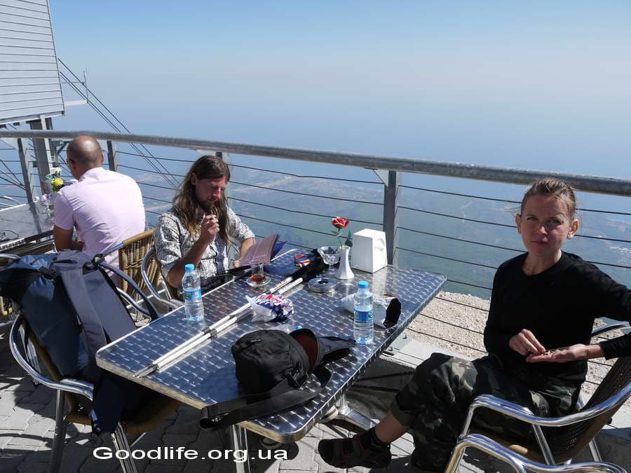 2 часа-и мы на вершине. Сюда с берега моря идёт канатная дорога. 10минут и 25 лир – и вы тут. Так что людей-толпа, ресторан, полёты на параплане – всё достаточно пошло. Ладно, раз это есть, нужно использовать.