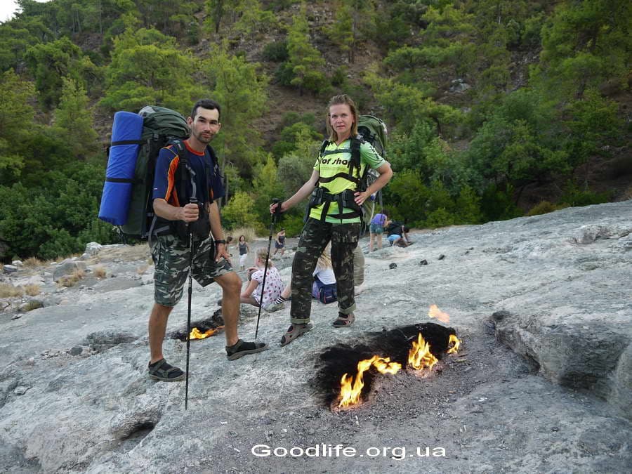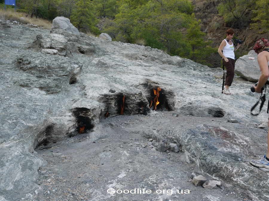 Тут же были и первые огни. Так необычно – прямо из земли-пламя, прямо как вечный огонь! С десяток огней. Существует длинная легенда из греческой мифологии, согласно которой Беллерофон на крылатом коне Пегасе втоптал здесь в землю огнедышащего дракона Химеру, но его огонь до сих пор вырывается из недр горы Янарташ. На самом деле это природный газ выходит здесь из-под земли и однажды загоревшись, не тухнет уже несколько тысяч лет. Пониже есть действительно большие огни, высотой до метра. Сюда уже доходят организованные экскурсии.