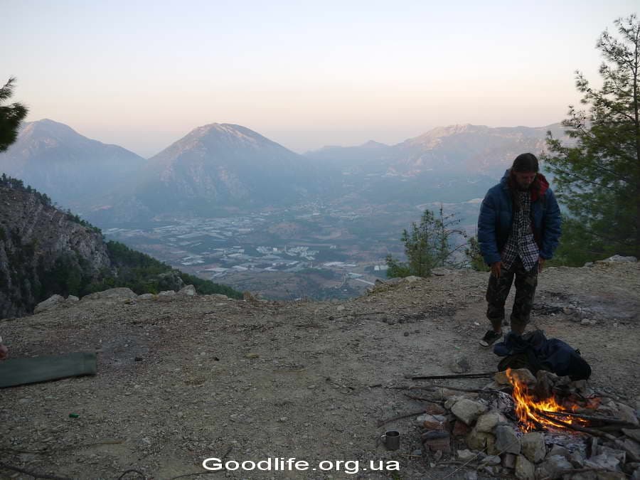 К 16:30 спустились к большой поляне на высоте 1280м с отличным видом на море и деревню Бейчик внизу. Там в палатке жил турок-фотограф, который сразу и бесплатно угостил нас горячим чаем и кофе с печеньем. Там же росли 2 яблони, плоды с которых нам тоже было позволено есть. Ура! Наелись яблок так, что думали, ужин уже не потребуется… Но потом всё же съели и положенный ужин. Чуть попозже подошла парочка немцев, тоже им тут понравилось. Турок работает на журнал National Geografic, фотографирует животных. А сейчас охотится за волками – спрашивал, не видали ли мы их по пути. Чрезвычайно разговорчивый турок (это впринципе касается всех турков) был разочарован нашим скудным словарным запасом в английском. Сам же он знал английский, немецкий, французский и немного испанский. Поэтому через 15 минут корявой беседы мы разошлись по своим делам. Вечером турок (имя его я так и не смог ни произнести, ни тем более запомнить) ещё презентовал нам целую сковородку баранины, а мы в ответ одарили его 200 гр сыра, привезённого из Киева. Прошли сегодня 15.5 км, подъём – 800м, спуск – 1100 м.