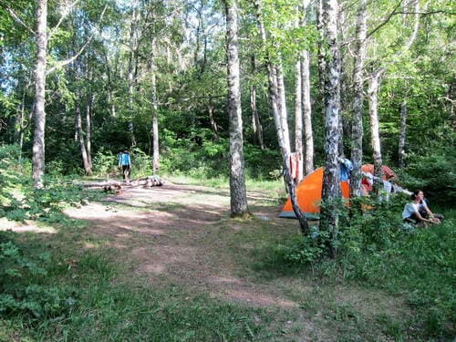 Дали маху, встав на стоянку на открытой продуваемой поляне. Часа в три дня (!) там было довольно неплохо, даже успели позагорать, но вечером пришлось переселиться в лес неподалёку.
