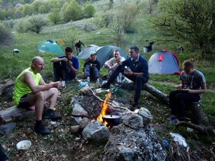 Вообщем, следующие несколько часов ушли у нас на дорогу к стоянке Ай-Алексий, куда мы пришли не самыми последними. По дороге нас также обгоняли груженные туристами уазики. На стоянке колоритный лесник взял с группы сколько-то гривен и мы пошли расставлять палатки. Пришли мы вовремя, заняли достаточно неплохое место, вдали от основной, в последствии пьяной тусовки…..
