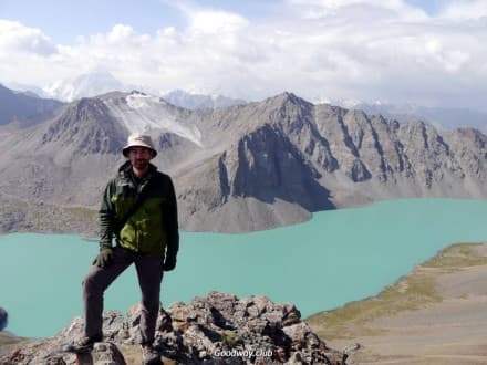 Это река, вытекающая из озера, срывается с 30-метровой скалы. Вид на озеро Ала-Кёль открылся довольно неожиданно, и сразу забылись все тяготы подъёма. Народу здесь оказалось много, в основном иностранцы со всего мира. Знакомые нам немцы уже поставили палатки. Как-то не понравилось мне тут. Места мало, ветрено и до воды метров 20 крутого спуска по камням. Разговорился с проводником-киргизом, который вёл группу французов. Он тоже не желал тут оставаться, и хотел пройти дальше через небольшой перевал и спуститься снова к озеру. Вроде там лучше стоянки. Однако, не знал английского и не мог это втолковать своей группе. Те думали, что он вообще не хочет ночевать у озера и гонит их куда-то дальше. Объяснили мы французам благие намерения их проводника, и сами тоже пошли на те стоянки. По словам киргиза, всего 15 минут идти. Я уже давно заметил, что местные не умеют правильно оценивать время и расстояние, постоянно его занижая. Минут 20 потребовалось только чтобы залезть на перевал, и ещё минут 15 на спуск. Стоянки оказались ещё выше от воды, чем предыдущие, и почти полностью заняты стационарным лагерем. В общем, место было ещё хуже, но киргизу почему-то нравилось, и он остановил свою группу здесь. А мы спустились на берег и нашли чудесную стоянку прямо у воды, да ещё и с видом на ледник и снежную вершину, ну просто VIP-стоянка!