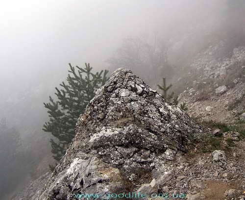 И сразу превратилось в туман, окутавший всё вокруг. Смотреть стало не на что, и мы пошли дальше по тропе. Хорошо, что до прихода облака удалось выяснить, куда дальше идти. Ведь тропа тут расходится на 4 направления. Самое левое — на северную Демерджи. Правее — на т/с Джурла. Ещё правее — тоже на т/с Джурла, короче, опаснее и красивее предыдущей, т.к. идёт по краю скалистого обрыва. Самая правая — вниз -в долину привидений и Лучистое. Выбираем опасную. А какую же ещё? Жаль только, красоты пришлось рисовать в воображении или вынимать из памяти. Густое облако отставать не хотело.