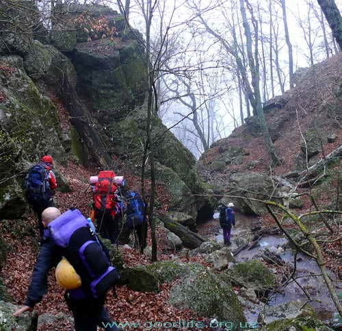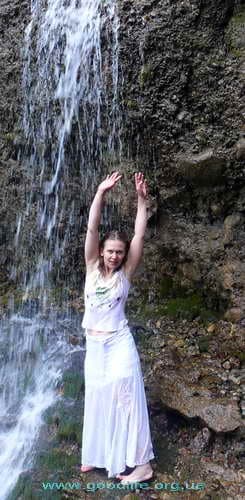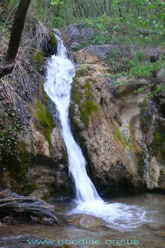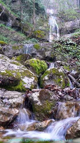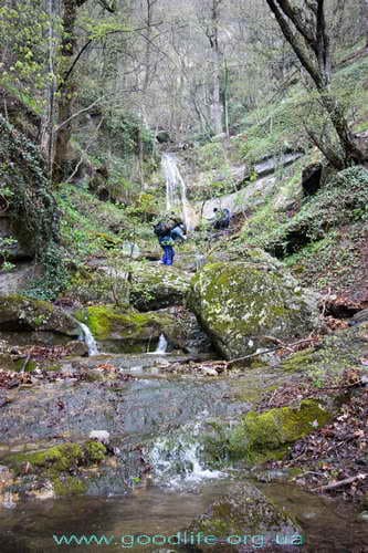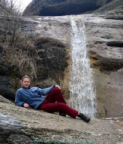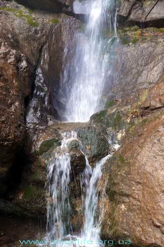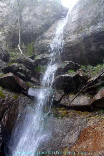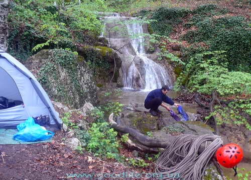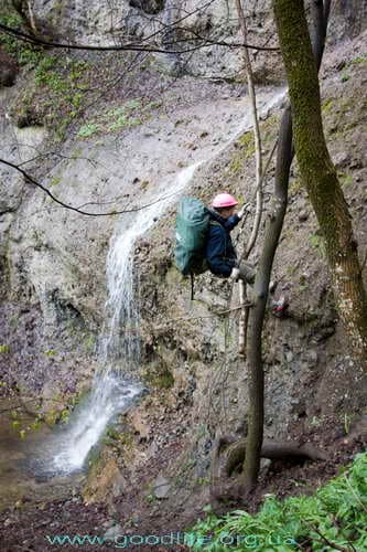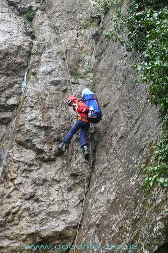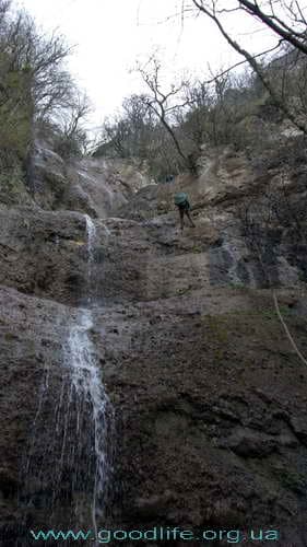 При взгляде вниз с 35-метровой отвесной скалы начинало быстрее биться сердце. У кого-то от страха, а у кого и от предвкушения экстремального удовольствия. Кстати, на всех дюльферах верёвку закрепляли на очень удачно выросшем, всегда в нужном месте, дереве. Так было и тут. Дерево росло как раз там, где надо. Верёвка, закреплённая на нём, проходила в 2-3 метрах от водопада. Ближе уже некуда — можно попасть под воду. Дальше тоже — мешали скалы и кусты. Херсонцы отстали, и больше мы их не видели. Днепропетровцы же опять не пожелали нас ждать, и сбросили свою верёвку возле нашей, но ближе к водопаду. Так что по пути их временами окатывало водичкой. Особенно не повезло их новичку. Спускался он третьим, двое товарищей наблюдали за спуском снизу. Я смотрю — парень совсем не может справиться с верёвкой. Его тянет к воде, он неумело и безуспешно сопротивляется, высокий рюкзак норовит опрокинуть. Поскольку его товарищи всё видели, спокойно начал снимать на видео будущий цирк. По пояс он промок ещё во время спуска, таки снесло в водопад, и спускался местами прямо в падающей воде. Бедняга израсходовал абсолютно все силы, и в полутора метрах над землёй его таки опрокинул рюкзак. Бессильное тело висело к верху ногами прямо под водопадом, верёвку заклинило, и он ничего не мог сделать. Друзья его спасать не спешили, и издалека давали «ценные советы» по выходу из кризиса. Один из них тоже снимал всё на видео. Парень наконец-то уже совсем истерично позвал на помощь. Подбежал наш Лёша Керченец, затем и те двое, парня сняли и отволокли от воды в сторону. Долго он сидел, ничего не понимая. Явно в шоке. Потом, наблюдая за струйками воды, вытекающими из него, задал совершенно идиотский вопрос: «А почему у меня дождевик так промок?». Оказалось, что совершенно не помнит, как висел вверх тормашками, и вода лилась снизу под дождевик. Минут через десять очухался, показал двумя пальцами победное V, сообщил, что было классно, только ноги устали, встал и шатающейся походкой отошёл дальше. Я таки снял всё на видео.