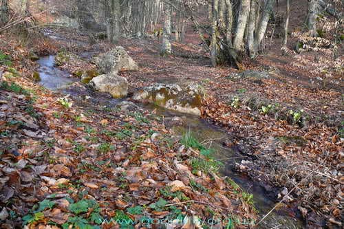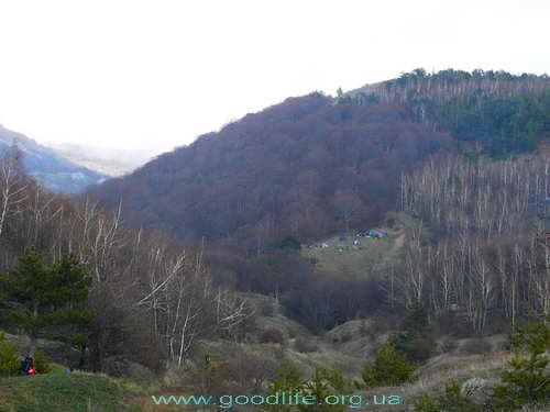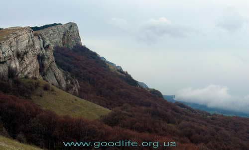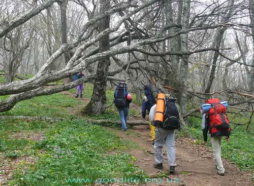 Проходил он через чудесный буково-грабовый лес. Из-за приличной высоты весна в нём задерживалась недели на 2-3. Почки только распустились, трава едва проросла. Тропа прошла мимо памятника строителям шоссе «Симферополь-Алушта». Совершенно непонятно, что он делает в лесу в километре от шоссе… Может, оно тут раньше проходило? Попутно с нами шли ещё 2-3 группы таких же неорганизованных туристов. Обгоняя и отставая, все перемешались основательно. У т/с «Поляна МАН» впервые открылся вид на горы.