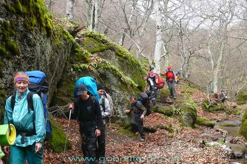 Итак, пройден самый высокий двухкаскадный водопад. Это треть пути. На часах 15:20. Потрачено 5.5 часов. Навязчивая арифметика подсказывает, что с таким темпом мы придём на стоянку где-то к 2-м ночи. Конечно, теперь уже будем пошустрее, и есть надежда прийти раньше. В каньоне есть несколько стоянок(штуки четыре), но все они очень маленькие — на 1-2 палатки. Наш огромный лагерь из 8-ми палаток требует много места. Поэтому ночёвка в каньоне исключена. Продолжаем путь вниз, надеясь на лучшее. Однако погода нас не баловала. Временами налетали облака (мы воспринимали это как туман), часто моросил дождь. Мы все грязные, мокрые. Скорее похожи на спелеологов, чем на туристов. За нами уже никто не шёл. Видимо, поверили арифметике и после второго каскада ушли наверх.