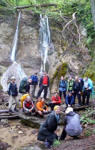 Там же предприимчивые нищие туристы выставили рекламную табличку «Услуги шерпа. 1 рюкзак в Лучистое или на Джур-Джур- 26,99грн». Стоянок у водопада тоже много, но все заняты. К вечеру подошёл и Славик с двумя москвичами. Они приехали в Симфи днём. Он их дождался там и привёл к нам. Мы уже начали переживать, что не встретимся. Радиосвязи никакой там не было. Наконец весь наш отряд в сборе. 16 человек.