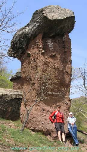 Около 2-х вышли к дороге. Скидываем рюкзаки и желающие идут осматривать «Каменные грибы». Быстрее пройти к ним было бы прямо с тропы. После одного из водопадов вдоль тропы начинает идти водопроводная труба. Потом сворачивает влево. Надо продолжать идти вдоль трубы. Приведёт прямо к грибам. Действительно, интересное чудо природы! На красных ножках с беловатыми шляпками. Самый высокий — 8м. Вся поляна усыпана грибами разного «возраста».