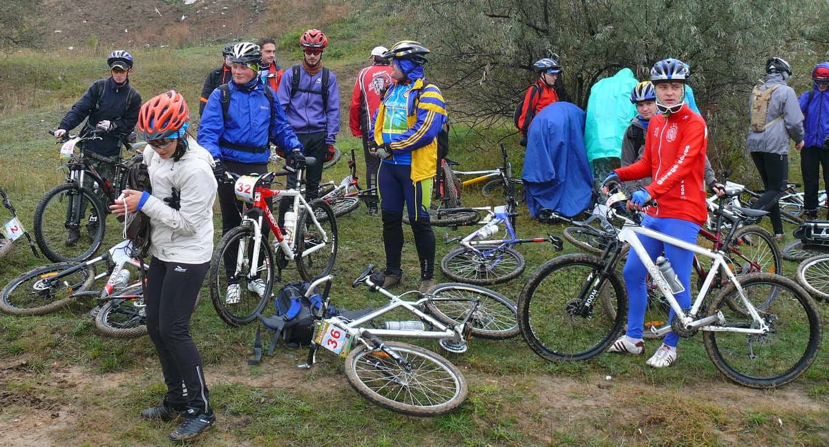 Больше и больше появлялось желание сойти на КП с дистанции и поехать по асфальту. Был я там в 15:30. Это примерно полпути. Заботливые девчонки дали банан, вафлю и наполнили флягу водой. Перед гонкой на сайте была информация, что в 16:00 — завершение марафона, подведение итогов. Я раньше 20:30 доехать не смогу. Спрашиваю девочек — имеет ли смысл ехать дальше как положено, по грунту? Говорят, конечно, имеет!. Ещё уверили, что вторая половина пути полегче. Подъехала Лена, спросил её, поедет ли дальше. «Конечно поеду, что ж я зря столько промучилась?» Перекусила тоже и вперёд. Шансов сойти с дистанции у меня теперь не было. Путь действительно был полегче, будто бы тут дождь меньше шёл. Так и ехали дальше, поддерживая друг дружку: то я впереди, то она. Загреблись на горку уже в сумерках. В этот раз никто из участников не заехал своим ходом. Все зашли. Немного отдохнули и покатили дальше.