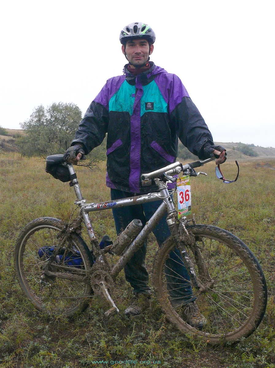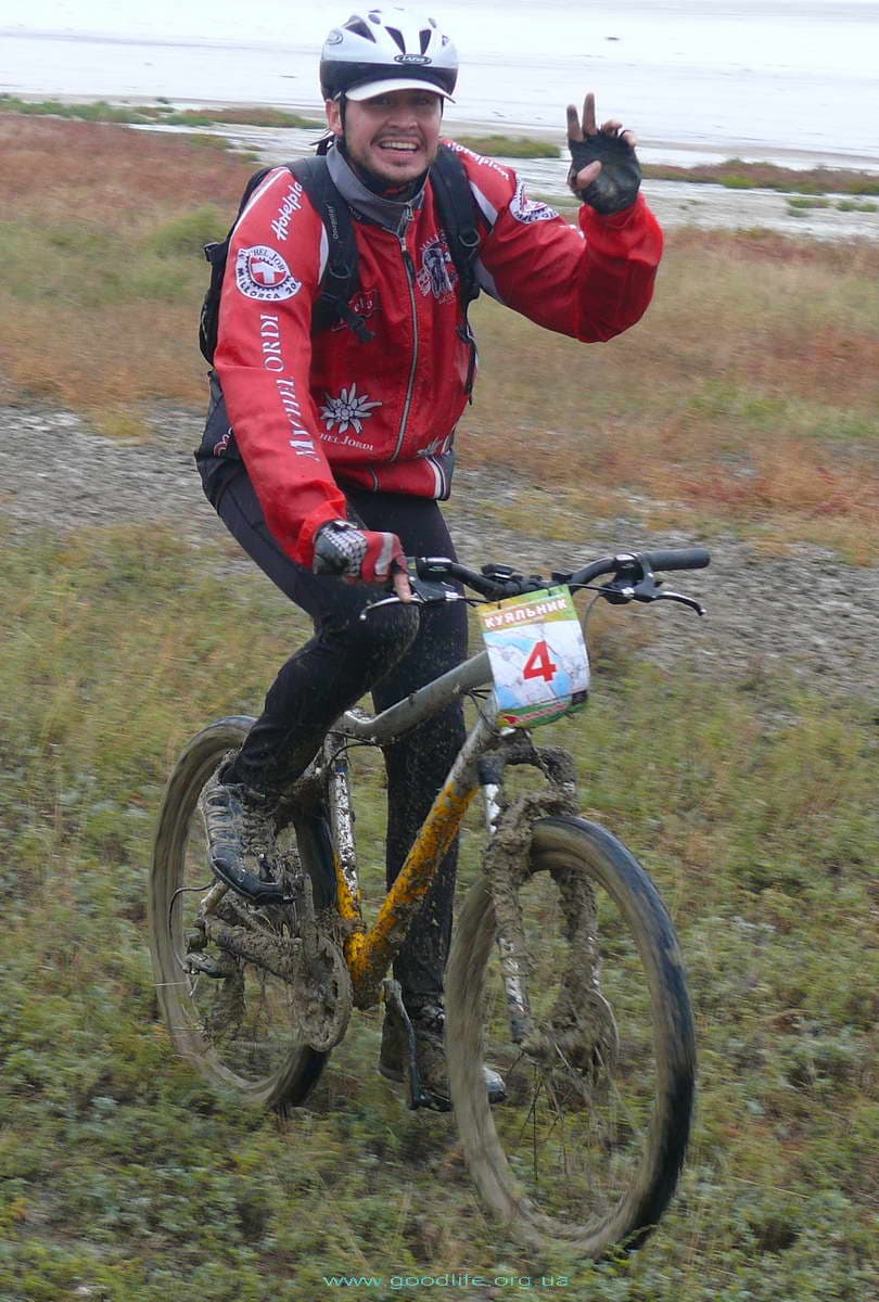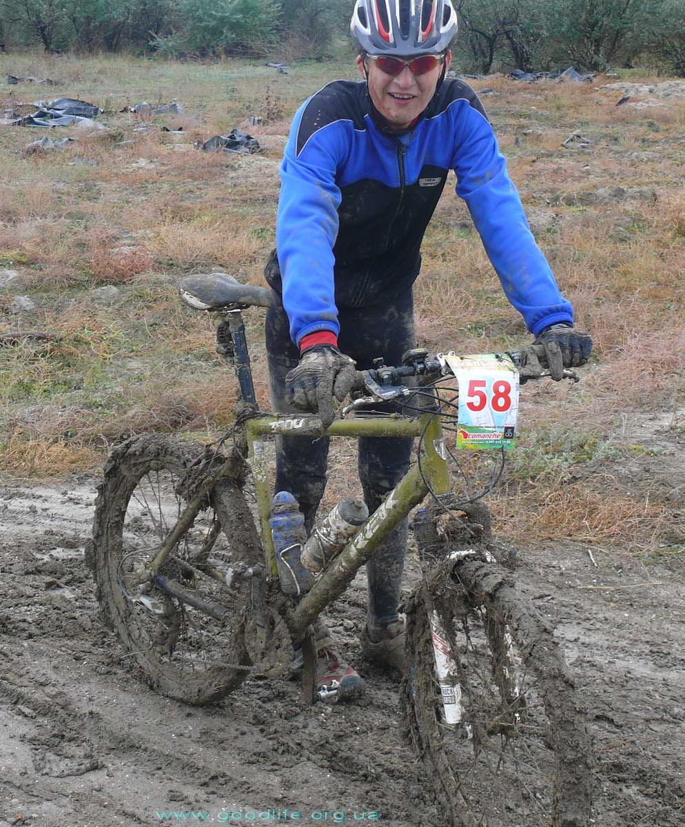 Догнал одного одессита, он совсем был скисший. Повернул не туда, потом возвращался 2 км. И всё это пешком… Без антипрокола, клеился по пути 4 раза. Повезло ещё. Могло быть хуже. Доели с ним мой сыр, пошли дальше. Позвонили мне организаторы, предложили выслать за нами эвакуатор. И, соответственно, дисквалификация. Ну нет! Не доедем, так донесём велики! Осталось каких-то 5 км. Откуда-то появились силы, и добрую половину тех 5 — ти км даже удалось проехать. Тут уже грязь налипала меньше, зато были лужи. Как их объезжать — ничего не видно, по парочке проехал — даже колёса отмылись, и ничуть не застрял. Но в темноте не видно и глубины, и в очередной я выкупался уже по колено. Тут конечно, застрял. О!!! Какие-то огоньки, люди… Финиш! Я предпоследний — обогнал того парня минут на 10. Но я доехал! Моё время — 10:03. Десять часов пешеходно-велосипедного похода вокруг Куяльника по грязюке. Такое запомнится навсегда.