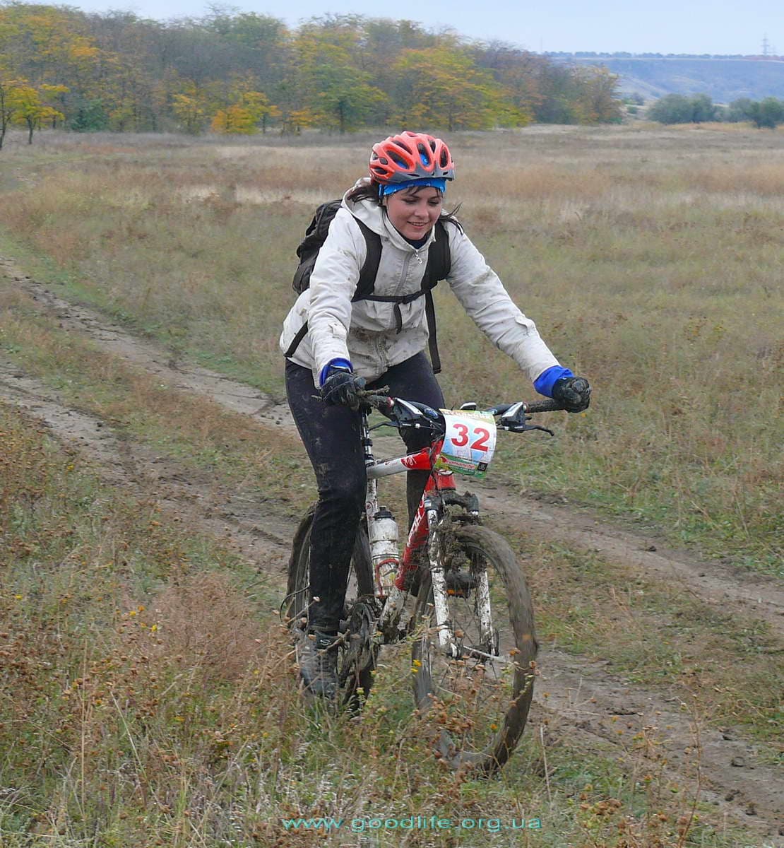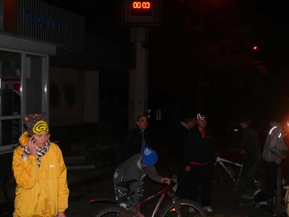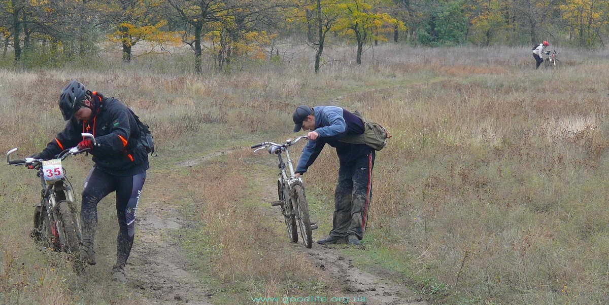 Катили мы недолго. Самое сложное испытание было впереди. Наверху оказалось много чернозёма и налипал он особенно зверски. Ехать быстро сил уже не было. Ехать медленно не получалось. Пришлось в основном идти. Иногда даже нести велик, поскольку 5 метров — и снова надо чистить. Стемнело. Нас догнал Лёша, дал Лене фонарик, дальше шли при фонарях. Где-то возле воинской части у Лены и Лёши терпелка закончилась, они свернули на асфальт. Жаль, не дошли всего 7 км. Хотя сделали правильно. Те 7 км были для меня самым сложным участком. Полная темнота, разметки на поворотах часто нет, нужно высматривать следы шин. Где вниз и можно поехать — давлю что есть мочи. Лужи, ямы… Несколько раз падал — обзор ограничен, не видно ни куда ехать, ни как объезжать. Один раз с горки хорошо разогнался, так переднее колесо как-то мгновенно забилось, и заклинило. Лечу я, значит, через руль в грязюку. Масса удовольствия. Организаторов вспоминал незлым тихим… Хотя при чем тут организаторы? Часов с 6-ти названивали каждые 20-30 минут и уточняли, где я и жив ли вообще… Сам попёрся на вторую часть, спокойно мог бы по асфальту объехать. Но всё-таки, когда лежишь в грязюке под великом, вокруг темно и никого, и даже нет уверенности, а туда ли едешь, только организаторов и приходилось вспоминать. Теперь, дома, понимаешь, как было классно и хочется поблагодарить всех, кто устроил гонку. Спасибо!