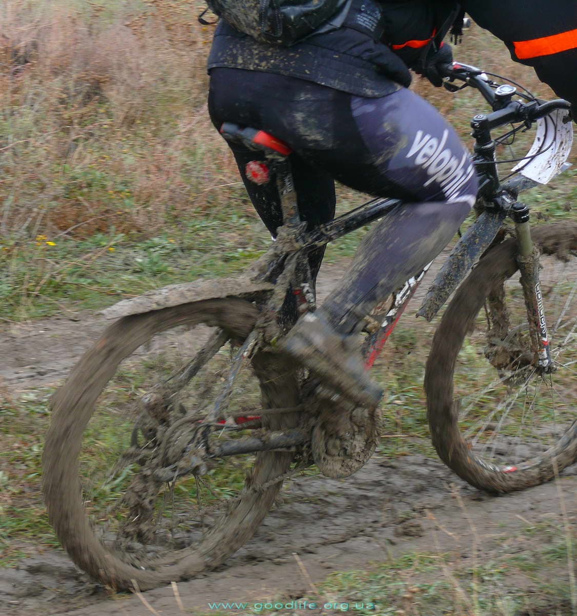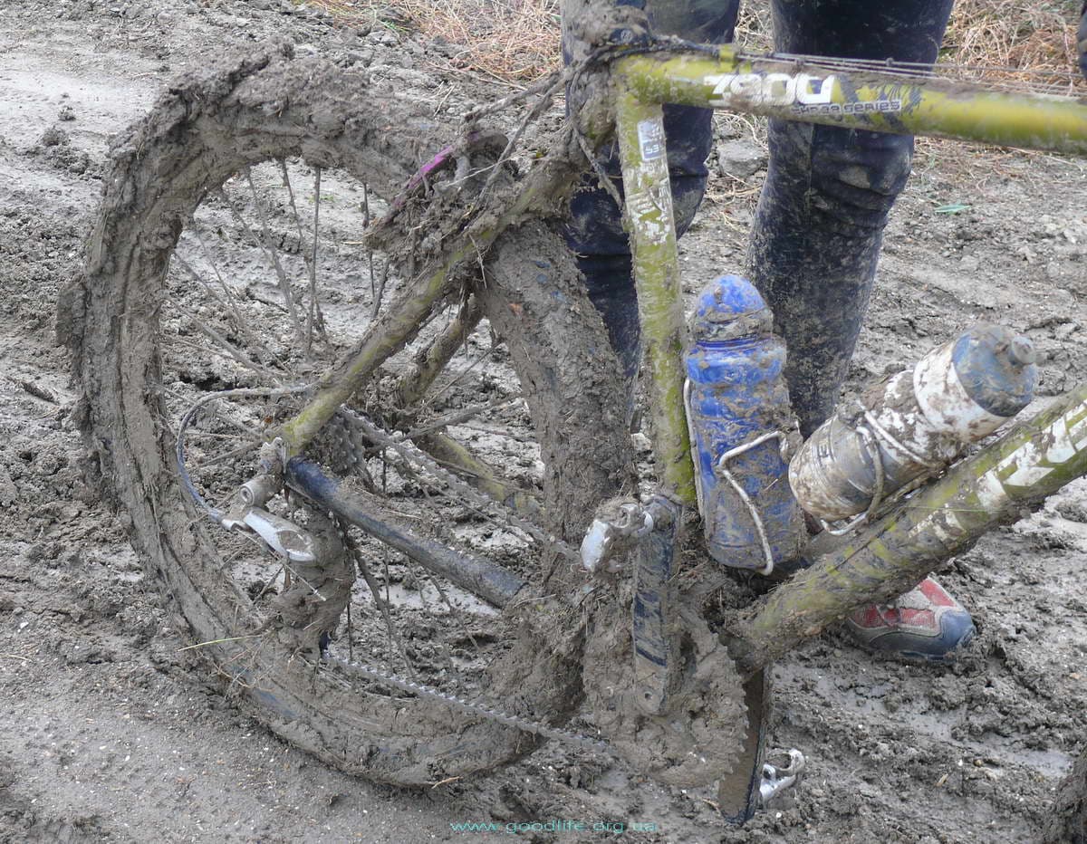 Первые же полкилометра вернули назад двух участников. Можно было ехать только по траве. Дорога совсем раскисла. Но местами трава была недоступна, и приходилось таки ехать по дороге. Грязь быстро забивала всю навеску. Это полбеды. Так ещё можно ехать. Но когда колёса вообще переставали крутиться, приходилось останавливаться и выкалупывать.
