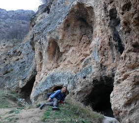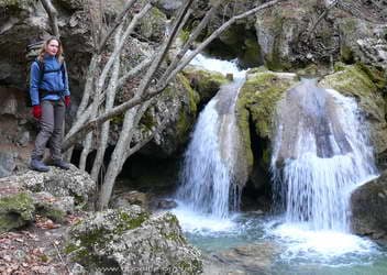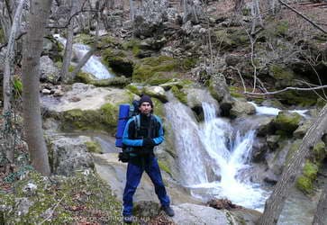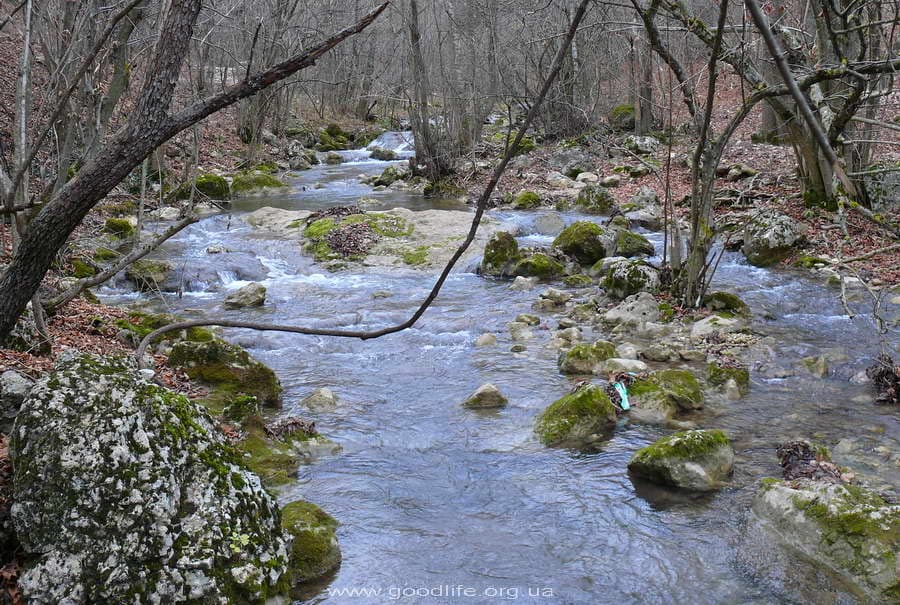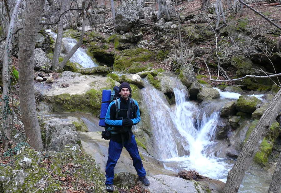 Вышли у поворота на Красные пещеры возле заправки. Обозначен знаком «Красные пещеры, водопад Су-Учхан». Пошли по асфальтовой дороге. Она выводит к кассе. За ней -аттракционы и тропа на Красную пещеру. Берут по 10 грн за проход в сезон. Сейчас никого не было. Можно с самого начала обойти эту кассу. В начале асфальтовой дороги, где мост, не переходить его а идти по правому берегу, по дороге к дому — трёхэтажной башне(хорошо виден), до полян, потом вдоль речки. Речушка порадовала обилием красивых перекатов и водопадиков, а главный водопад – Су-Учхан выглядит особенно впечатляюще.
