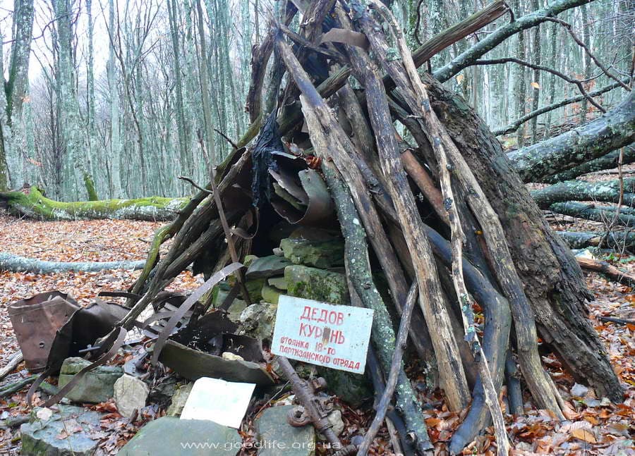 Дальше – курс на Курган Славы. Его видно издалека. Выглядит как холм со столбом. Попутной тропинки нет, идём напрямую. Долгоруковская яйла порадовала относительной ровностью. Небольшие холмы и воронки. Идти легко и приятно. Облака висят прямо над головой, почти цепляют землю. Соседняя Демерджи-яйла выше метров на 50 и уже в облаках. Во время войны в этих краях было много партизанских отрядов, о чём свидетельствуют несколько десятков памятников и знаков, встретившихся нам по пути. Особенно впечатлил «Дедов Куринь», сложенный из веток, с бытовыми железяками из партизанского лагеря и скромной табличкой.