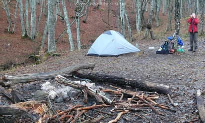 Поднялись мы немного по тропе и нашли неплохое место для лагеря. К тому времени уже давно шёл мелкий дождь. Натянули тент, рядом поставили палатку. Костёр разводить не стали, поужинали и к 6-ти уже улеглись спать. День выдался насыщенным, быстро уснули. Всю ночь шёл дождь.