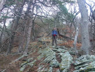 Сегодня в планах дойти до водопада Джур-Джур. Мы хотели идти туда по верху — через Тырке-яйлу – так заметно короче и интересней. Но когда увидели, что уже на подходах всё затянуто густым туманом, решили идти низом. Странная тропа 147 делает у яйлы загадочные повороты, которые оказалось нелегко найти. Разметки нет, и пару раз повернув не туда, я решил не связываться больше с этой тропой и пойти напрямую через лес. К тому же GPS показывал, что до водопада всего 2 км, а по тропе – более 5-ти. По лесу проложено множество звериных троп, и ни одной человеческой. Но идти оказалось вполне возможно и не сложно. Скоро стал слышен шум воды. Неожиданно мы вышли на контрфорс, по пейзажу напоминающий тропу Таракташ.
