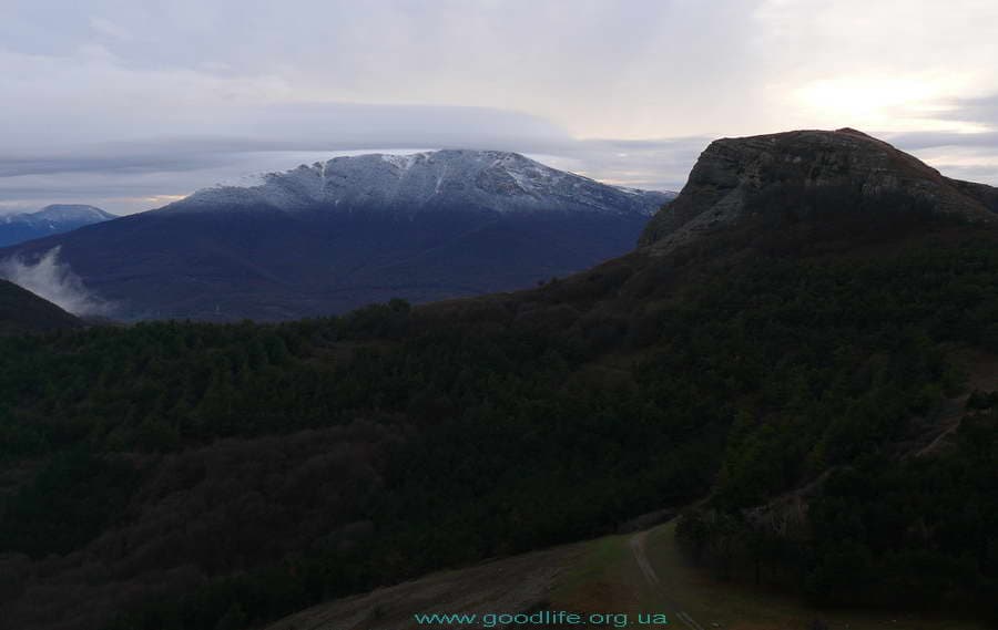 Утром светает в 6:30. Подъём в 6:00. После 11 часов сна это не проблема. Снова завтрак на горелке(дрова собирать лень), и в путь. Не доходя чуть до пещер — указатель «<яйла». Сворачиваем. Начинается очень крутой подъём. С яйлы открылся великолепный вид на Чатыр-Даг и с. Перевальное. Весь наш вчерашний путь виден, как на карте.