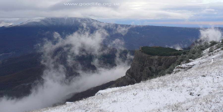 Красота Декабря непередаваема! В это время года в Крыму осень и зима сменяют друг друга, словно соревнуясь, кто из них замечательнее! Безумно понравилась панорама со смотровой площадки по дороге из урочища Хапхал к каньону р. Джурла. Морское побережье с бухточками и заливами, Меганом на горизонте, облака нескольких уровней – начиная от тех, что под ногами, и заканчивая той неуловимой линией, где Море сливается с Небом… Необычная светло-синяя дымка окутала бессчетное количество «дальних планов», и всё вместе выглядело настолько фантастически, что напоминало пейзаж загадочной прекрасной планеты, какую любят изображать с помощью компьютерных спецэффектов.