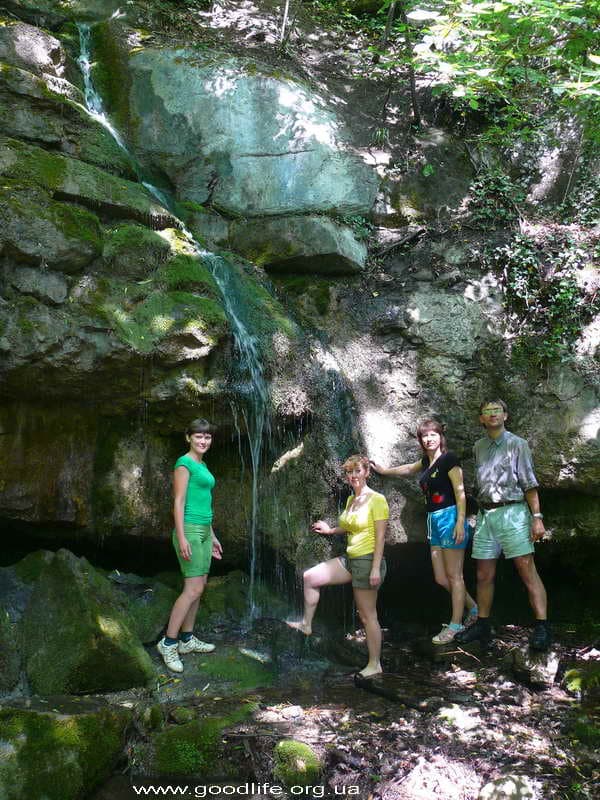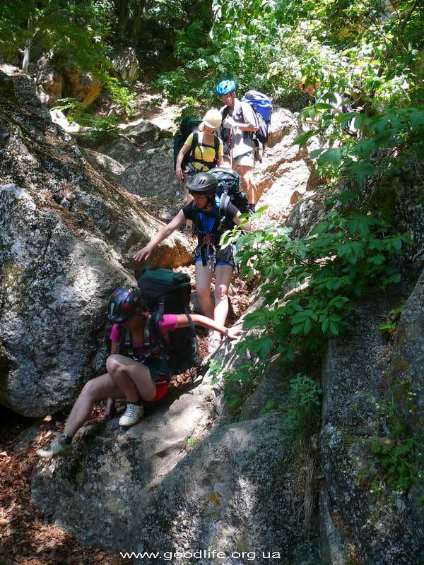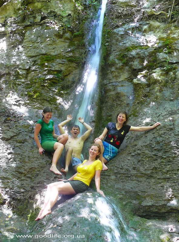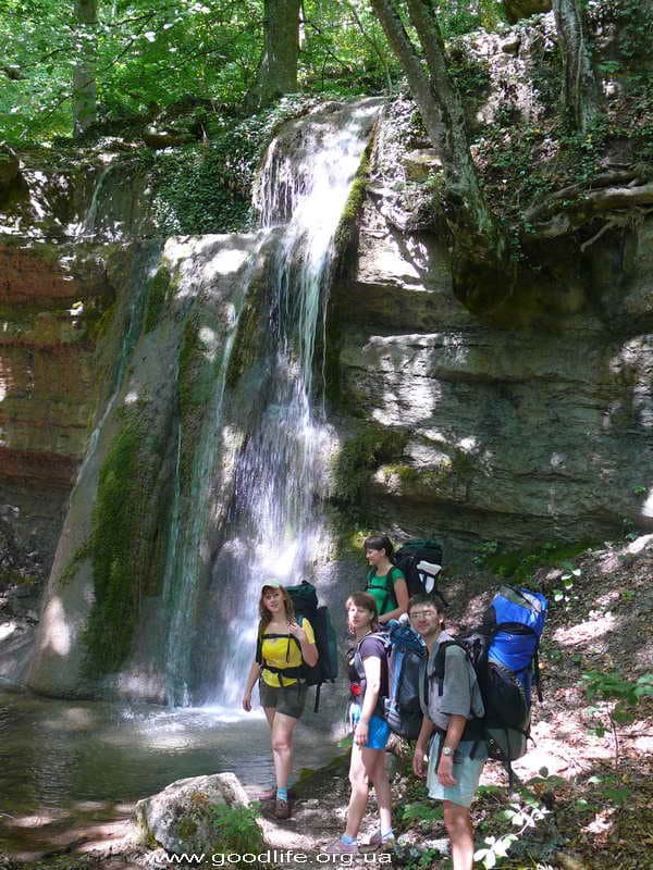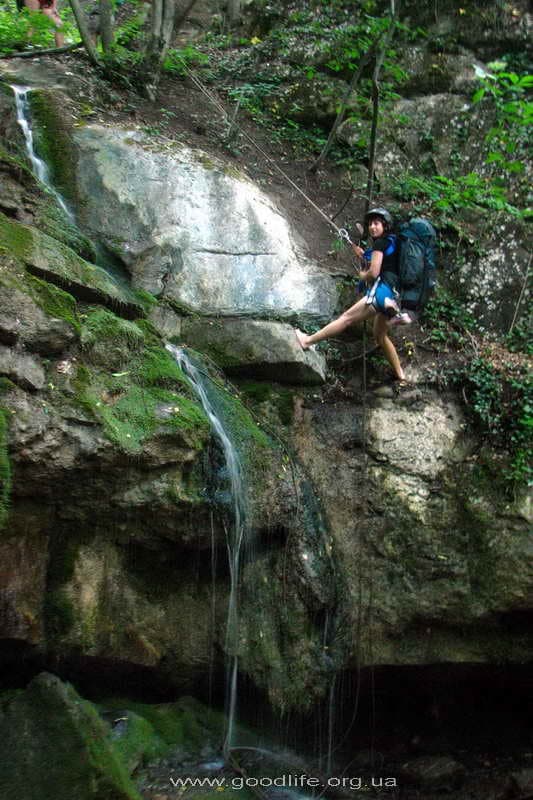 Утро моей мечты: нежное пение птиц, яркое, ласковое солнышко, довольные лица единомышленников.Завтрак туриста-рюкзачника: овсяная каша с изюмом, курагой, орехами, чай с печеньем. Подкрепились и за новыми эмоциями. Я с нетерпением ждала водопадов и вот он. Первый. Не большой, но красивый. Вода холодная, а не искупаться нельзя, он манит. Прошли немного и остановились возле скалы, на которой провели тренировку спуска на дюльфере. Андрюша научил нас одевать страховочные системы. Вместе с Аркадием проинструктировал, как правильно спускаться на дюльфере. И тут началось самое интересное. Ощущения: страх и любопытство. Мы по очереди спускались вниз, сначала без рюкзаков, затем с рюкзаками. Перед спуском много вопросов в голове возникает: «Куда я попала? И где мои вещи? Зачем мне это нужно?» Спуск за спуском и все разные. Эмоции захлестывают. Страх, конечно же, присутствует, но любопытство побеждает его.