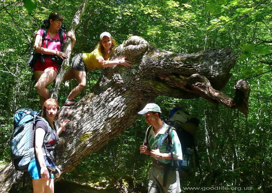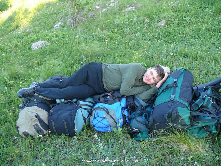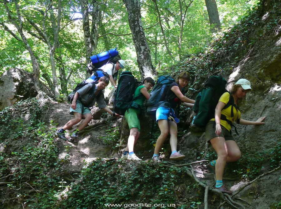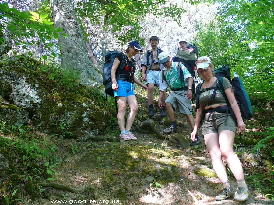 Наша компания: я, Андрей Кравчик (инструктор), его хороший знакомый Аркадий, мои однокурсницы Оксана и Наташа, и наш новый знакомый Андрей, который приехал из Донецка. Начали с Ангарского перевала. Все, кроме Аркадия, в походе впервые. С отличным настроением, но немножко трусливым взглядом — пошли. На плечах большие (как мне тогда казалось) рюкзаки весом в 9-12 кг, инструктор обещает, что скоро мы с ними сроднимся и забудем что они на плечах, но пока в это трудно верится. Прошли пустяцкие метров 200, появилась усталость в ногах и страх: «А что же будет дальше?» Но, пройдя еще некоторое расстояние, открывается первое дыхание, начинаешь чувствовать запах леса, слышать пение птиц, усталость незаметно проходит и остается наслаждение.