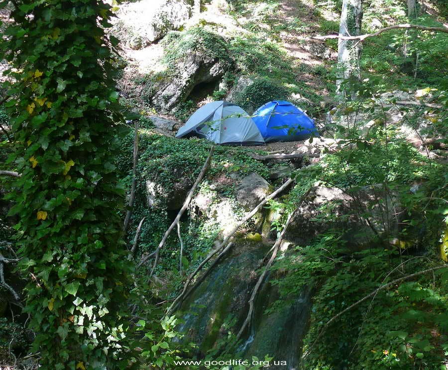 Спуск за спуском, высота дюльферов от 15 до 28 метров. И только мы вошли во вкус как все они закончились. Подустали малость и после последнего спуска у красивого водопада остановились на ночлег. Вокруг красота! На стоянке нас ожидал подарок от предыдущих гостей этих мест: каша арнаутка, соль, спички и банка с приветами-пожеланиями. Мы тоже свой привет туда положили.