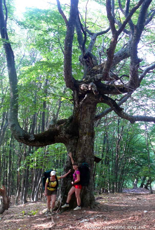 Было уже поздновато, мы подуставшие, много пройти не могли. Дошли к роднику набрали водички и остановились на ночлег на т/с Буковая поляна. Вокруг массивные, высочайшие буки, воздух чистый, нежный.