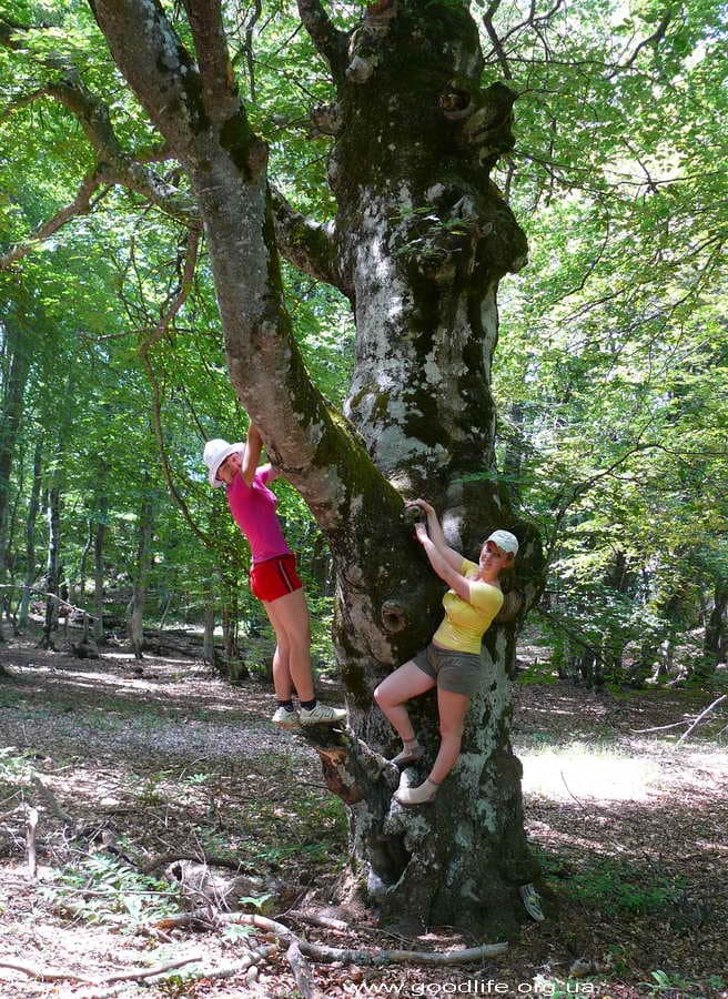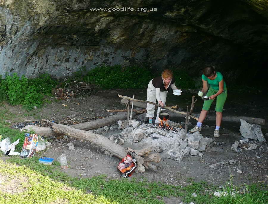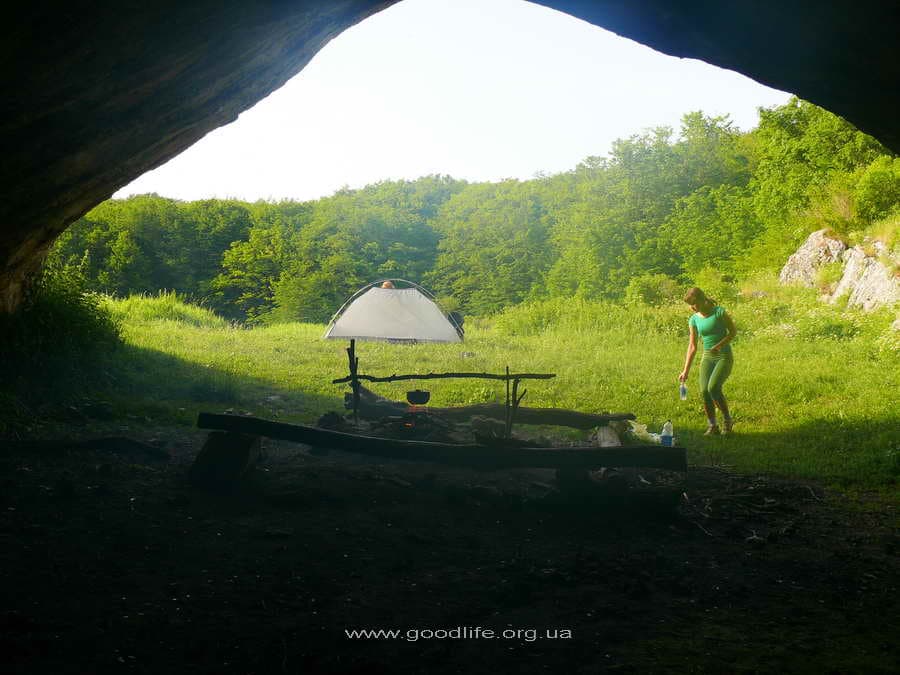 Выходя из леса, вдали увидели виднеющийся огромный грот. Безусловно, мимо него мы пройти не могли. Когда подошли ближе, ахнули от удивления — настолько он большой. Полюбовались и решили, что именно здесь мы останемся на ночлег. Потом пошли к пещере Бинбаш-коба (Тысячеголовая). Она была больше предыдущей (длина 110 м).