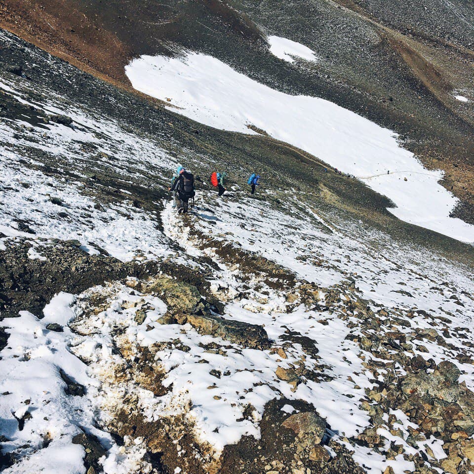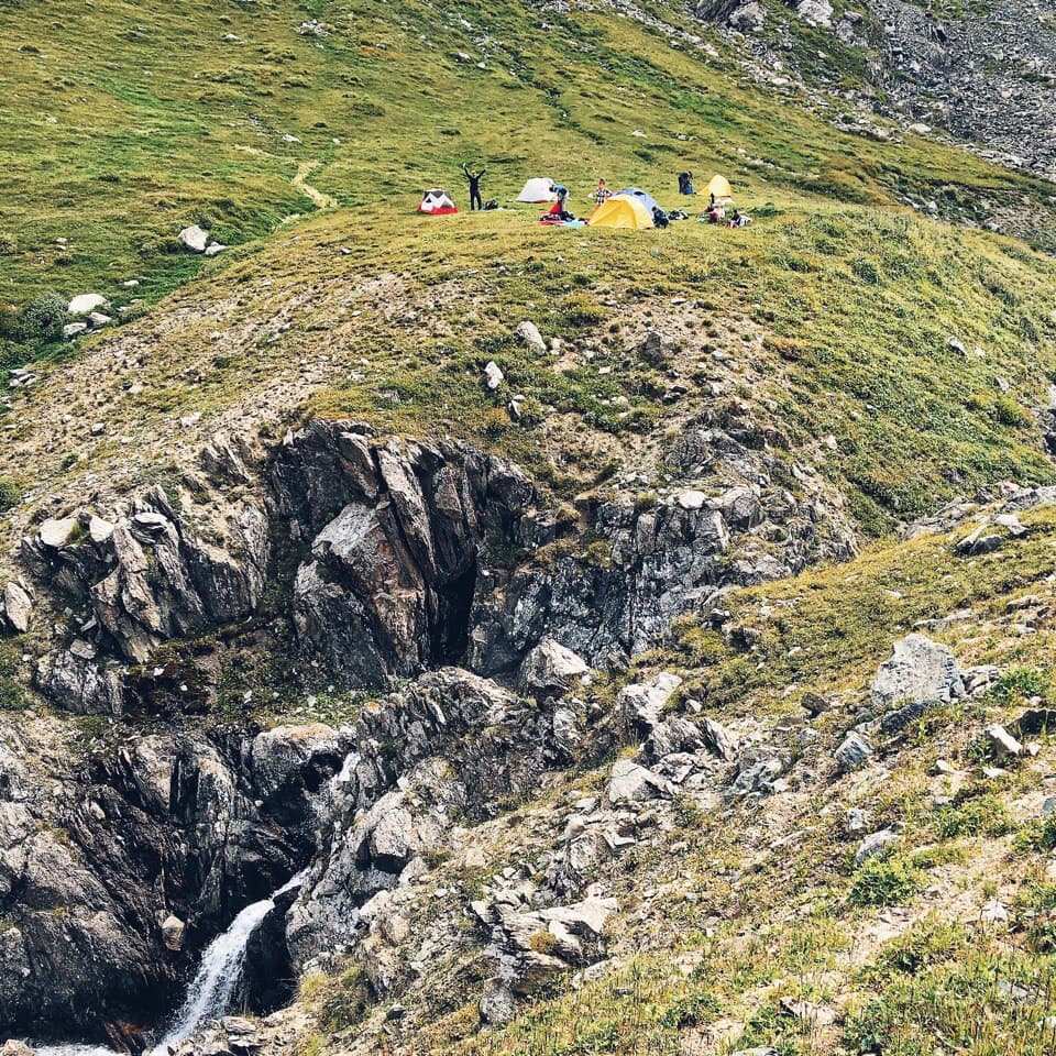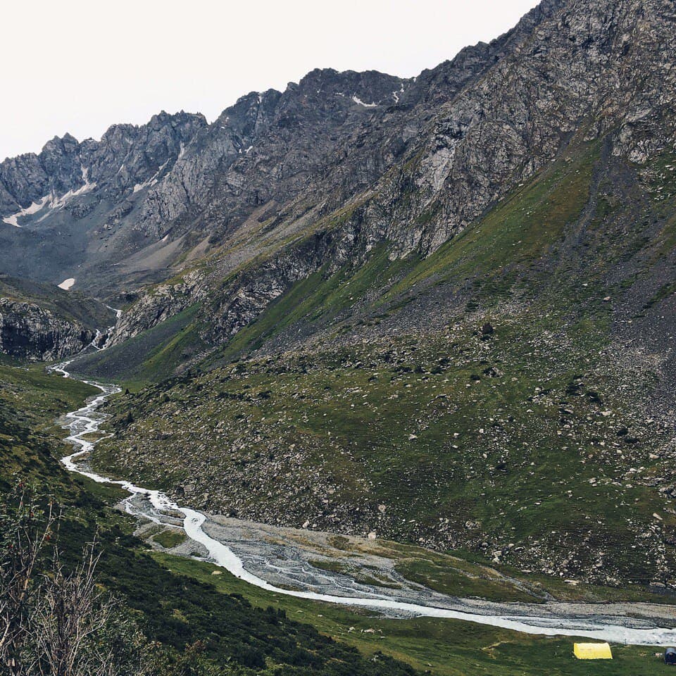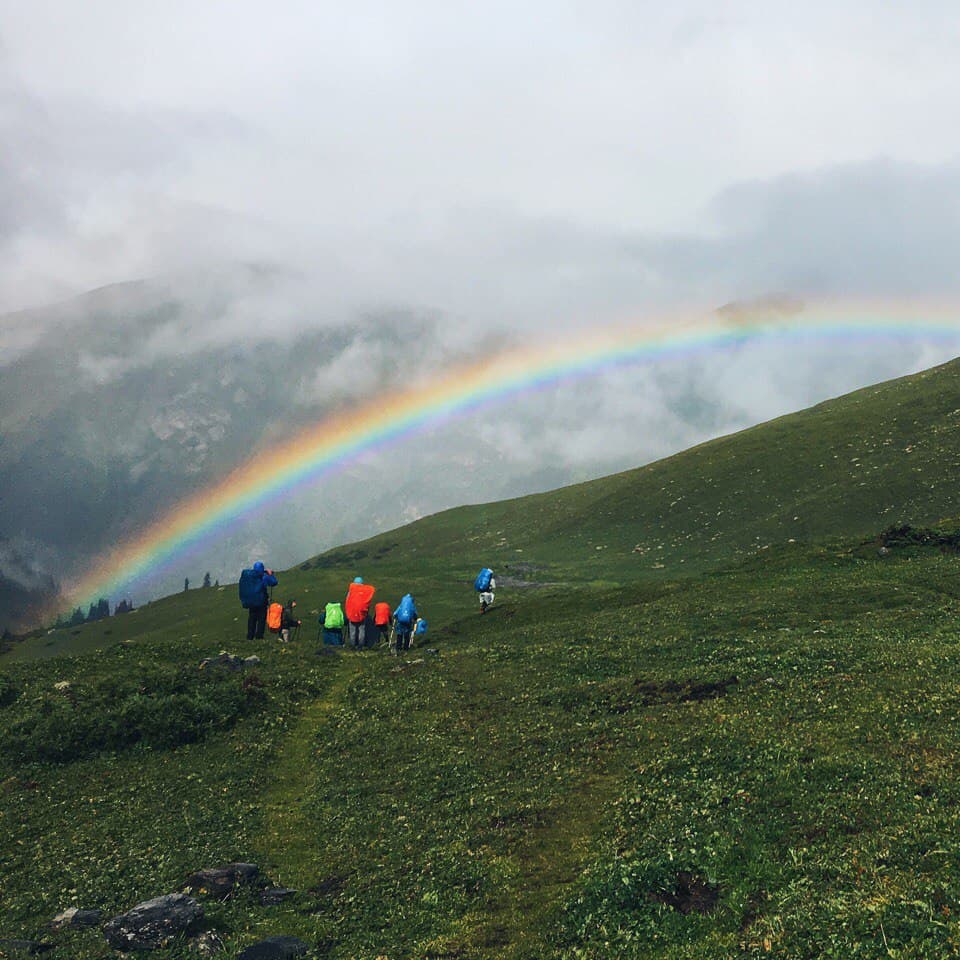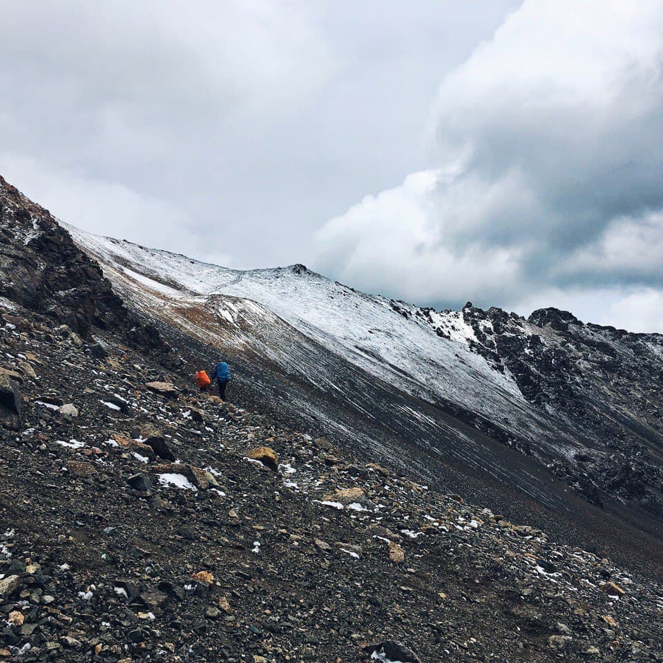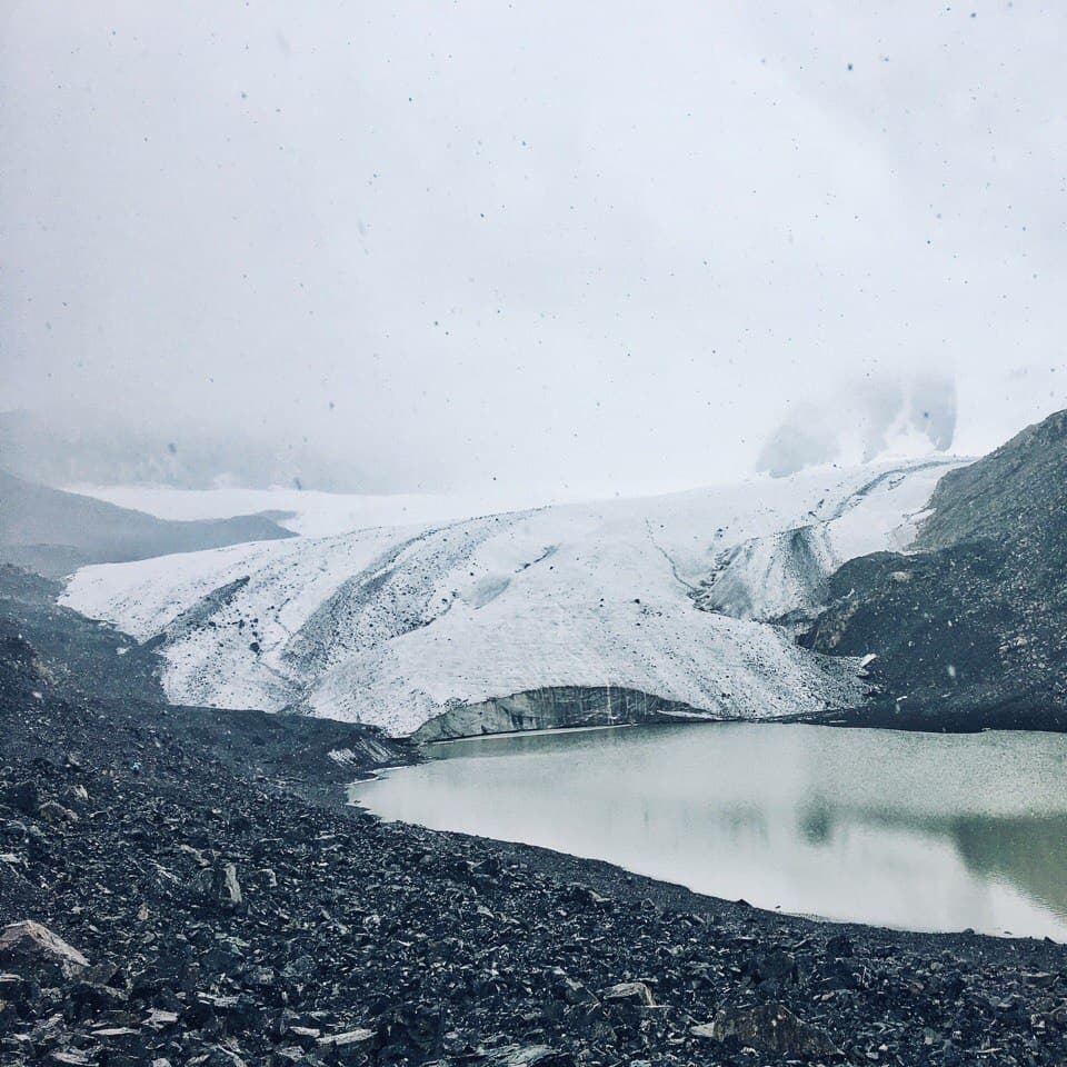 Утром теплее не стало, град так и лежит у палатки, но в целом солнечно. Во время завтрака решаем, идти на ледник или сразу уходить через перевал. К слову, по плану было остаться у озера ещё на одну ночь, и если бы была хорошая погода и можно было купаться мы бы так и сделали. Но! погода не задалась, и мы решили уйти от озера раньше, вопрос стоял в том успеваем ли мы рвануть на ледник!? Решили, что успеваем. Вышли мы сразу после завтрака и пошли вдоль этого чудесного озера, на нас потихоньку начал сыпать снег )) сначала это было не слишком напряжно, ветер дул в спину и на снег не слишком обращали внимание. Дорога оказалась сложнее, чем показалось на первый взгляд, но было очень живописно, вокруг озера, с подъемом по курумнику раза три или четыре и по камням к леднику, в снег, к леднику! Летом. Дорога в сторону ледника была хоть и сложной, но скорее приятной, ближе к леднику снег усилился) Очень интересное чувство, ходить по снегу, зная, что на дворе лето, вспоминая как вчера тебя пекло солнце, а неделю назад ты умирал от жары! Ледник впечатляет! Особенная атмосфера создавалась за счет снега, который падал на нас сверх. Когда собрались в обратную дорогу, снег усилился и теперь летел нам в лицо! Был сильный ветер, хлестал снежинками по векам, глазам и щекам, куртка превратилась в сугроб, руки в перчатках онемели , скользкий курумник был невыносим, тропу быстро заметало снегом и впереди идущего не было видно! А мысль о том, что нам еще переходить через перевал внушала ужас. Когда вернулись в лагерь, таки было решено переваливаться, пока погода позволяет, закончился снег. Мы практически без перекуса рванули на 3900 с 3500, по заснеженной тропе и любимому курумнику, съев только кусочек шоколадки и пару ложек горячей гречневой каши. Идти в гору на такой высоте особенно тяжело, как только увеличивается темп, заканчивается дыхание и колотится сердце, как бы ты не хотел идти быстро, это просто физически невозможно! По мере подхода к вершине усиливается ветер и тропа становится прямой, кажется что этот кусок пройти проще, но нет )) помогал ветер, который дул в спину и подгонял забраться на перевал )). на верху много снега и сносит ветром, к нужному месту по хребту я добралась с перебежками, когда ветер ослабевал. Потом спуск — это самый прекрасный крутой спуск в моей жизни!!! Мелкая сыпуха, на который едешь как на лыжах, очень легко и быстро, спустившись с перевала, я решила ПОДраздеться, решив что самое сложное уже позади )) ха ха, мы немного перекусили и пошли по долине между хребтов, и снег пошел за нами)) Итог мокрая насквозь куртка, дождевик было лень одевать, казалось дождь со снегом вот вот закончится. Апофеозом дня стала переправа через реку, в брод по колено ледяной воды, с криками и с ботинками в одной руке и палками в другой. И как только мы перешли реку, оказались как будто в Нарнии. Дождь прекратился, стало потихоньку выглядывать солнышко, образовалась огромная радуга, через которую мы все хотели пройти, но выяснилось ее не догнать, она тоже уходила вперёд. Вокруг парящие горы, облачка пара и неимоверная красота, еще чуть чуть к реке по грязи и мы на стоянке!! вечером мы сидели у костра и совершенно не верилось что это все один день, что ледник был сегодня! А еще наблюдали падающие заезды, много и красиво, звездопад же, завтра идем на горячие источники наслаждаться жизнью!