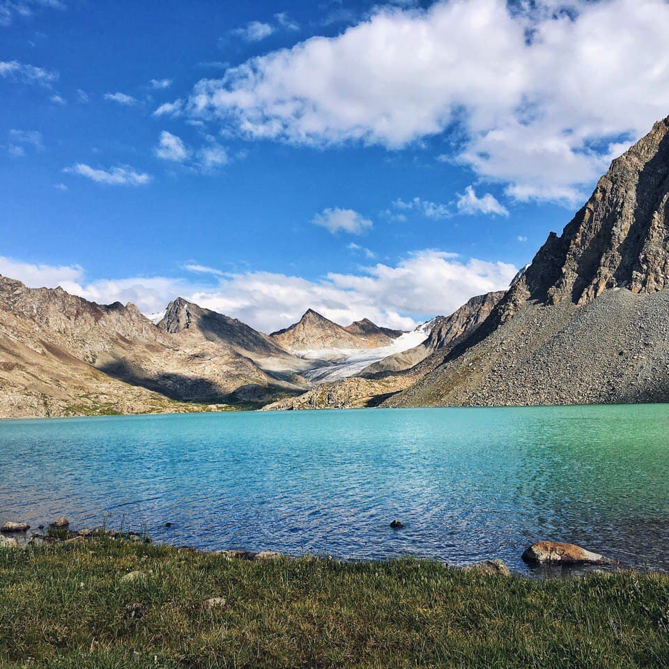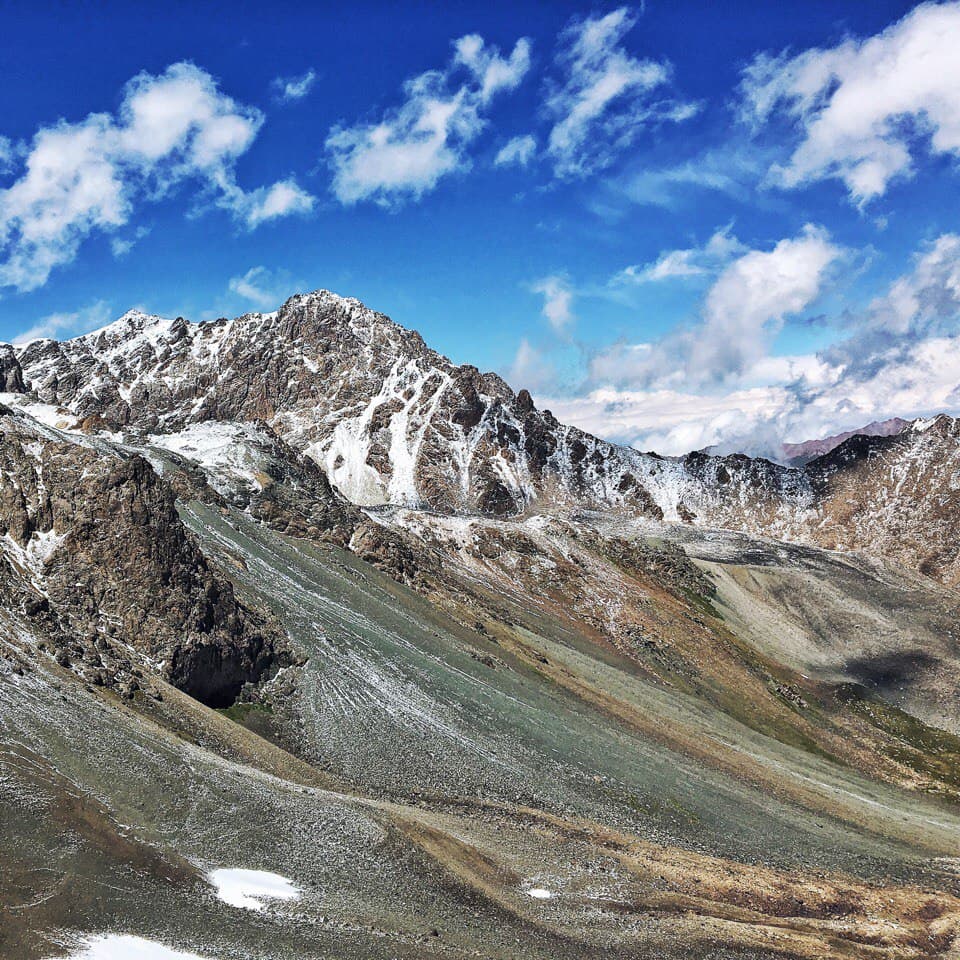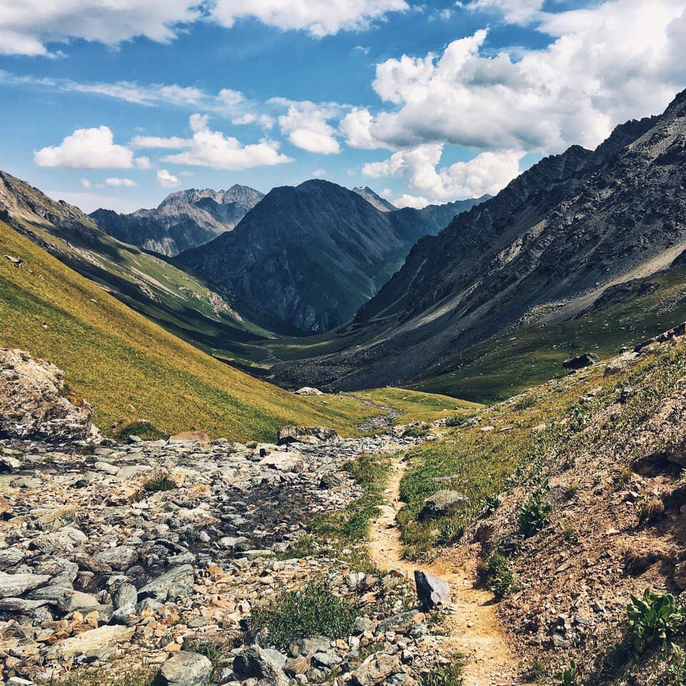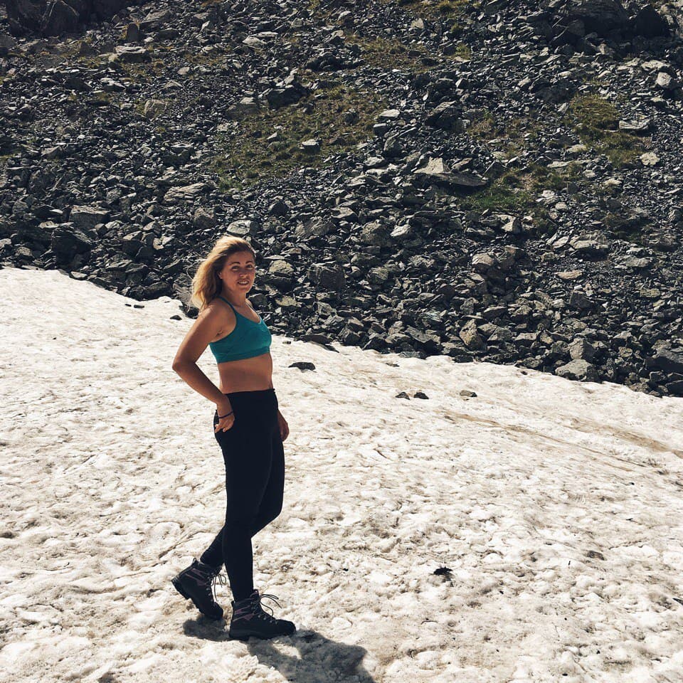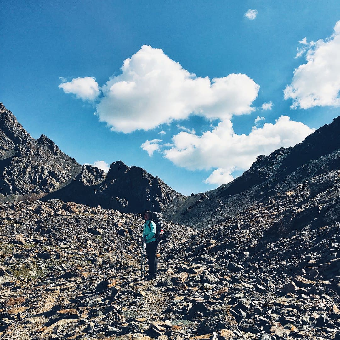 Утром теплее не стало, град так и лежит у палатки, но в целом солнечно. Во время завтрака решаем, идти на ледник или сразу уходить через перевал. К слову, по плану было остаться у озера ещё на одну ночь, и если бы была хорошая погода и можно было купаться мы бы так и сделали. Но! погода не задалась, и мы решили уйти от озера раньше, вопрос стоял в том успеваем ли мы рвануть на ледник!? Решили, что успеваем. Вышли мы сразу после завтрака и пошли вдоль этого чудесного озера, на нас потихоньку начал сыпать снег )) сначала это было не слишком напряжно, ветер дул в спину и на снег не слишком обращали внимание. Дорога оказалась сложнее, чем показалось на первый взгляд, но было очень живописно, вокруг озера, с подъемом по курумнику раза три или четыре и по камням к леднику, в снег, к леднику! Летом. Дорога в сторону ледника была хоть и сложной, но скорее приятной, ближе к леднику снег усилился) Очень интересное чувство, ходить по снегу, зная, что на дворе лето, вспоминая как вчера тебя пекло солнце, а неделю назад ты умирал от жары! Ледник впечатляет! Особенная атмосфера создавалась за счет снега, который падал на нас сверх. Когда собрались в обратную дорогу, снег усилился и теперь летел нам в лицо! Был сильный ветер, хлестал снежинками по векам, глазам и щекам, куртка превратилась в сугроб, руки в перчатках онемели , скользкий курумник был невыносим, тропу быстро заметало снегом и впереди идущего не было видно! А мысль о том, что нам еще переходить через перевал внушала ужас. Когда вернулись в лагерь, таки было решено переваливаться, пока погода позволяет, закончился снег. Мы практически без перекуса рванули на 3900 с 3500, по заснеженной тропе и любимому курумнику, съев только кусочек шоколадки и пару ложек горячей гречневой каши. Идти в гору на такой высоте особенно тяжело, как только увеличивается темп, заканчивается дыхание и колотится сердце, как бы ты не хотел идти быстро, это просто физически невозможно! По мере подхода к вершине усиливается ветер и тропа становится прямой, кажется что этот кусок пройти проще, но нет )) помогал ветер, который дул в спину и подгонял забраться на перевал )). на верху много снега и сносит ветром, к нужному месту по хребту я добралась с перебежками, когда ветер ослабевал. Потом спуск — это самый прекрасный крутой спуск в моей жизни!!! Мелкая сыпуха, на который едешь как на лыжах, очень легко и быстро, спустившись с перевала, я решила ПОДраздеться, решив что самое сложное уже позади )) ха ха, мы немного перекусили и пошли по долине между хребтов, и снег пошел за нами)) Итог мокрая насквозь куртка, дождевик было лень одевать, казалось дождь со снегом вот вот закончится. Апофеозом дня стала переправа через реку, в брод по колено ледяной воды, с криками и с ботинками в одной руке и палками в другой. И как только мы перешли реку, оказались как будто в Нарнии. Дождь прекратился, стало потихоньку выглядывать солнышко, образовалась огромная радуга, через которую мы все хотели пройти, но выяснилось ее не догнать, она тоже уходила вперёд. Вокруг парящие горы, облачка пара и неимоверная красота, еще чуть чуть к реке по грязи и мы на стоянке!! вечером мы сидели у костра и совершенно не верилось что это все один день, что ледник был сегодня! А еще наблюдали падающие заезды, много и красиво, звездопад же, завтра идем на горячие источники наслаждаться жизнью!