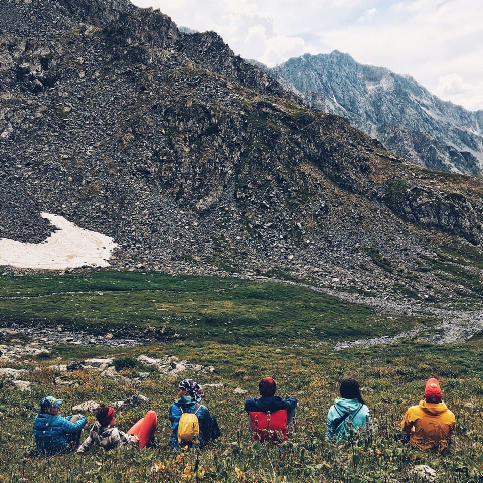 С утра и до вечера, как в 9 вышли так и до 5 шли, шли только вверх! Был перерыв на обед как всегда орешки и сладкое, идеальный обед, ничего лишнего, чистая энергия! И снова вверх. Тяжело очень. Очень тяжело. С 2500 мы поднялись до 3500, а потом еще чуть чуть. Но все это в такой красоте, просто невообразимой красоте! Когда мы забрались на очередной перевал, стало видно озеро, такой красоты я не видела никогда, честно, до слез, до мурашек! Хотелось сесть и созерцать и никуда больше не ходить, как будто, вот оно, всё, пришли. Может это восприятие было усиленно новостью, что этот перевал не последний и нам еще чуть-чуть вверх, а потом чуть-чуть вниз. Эта новость меня настолько шокировала, что пришлось устроить небольшую истерику. Вот нет сил идти дальше, совсем, ни капли, но… берешь себя в руки, свой смех, слезы, выдыхаешь и двигаешься дальше вверх, на перевал, а за перевалом вниз, привет коленям. И вот мы стоим у озера, ребята уже поставили палатку, готовится еда, приходит туча и начинается дикий дождь, который затем переходит в град, стоим мы на высоте 3500, тучи проплывают прямо мимо палатки, над озером, очень низко, все заволакивает белой пеленой, кругом молоко. А в палатке уютно и тепло с друзьями , а снаружи много града, ветер, молнии и гром, в горах, особенно на высоте, гром воспринимается по другому, страшно жуть, все рядом, все близко. Когда все утихло, мы смогли выйти и отряхнуть палатку от снега. Вокруг такая красота, вершины в снегу, озеро темное, снежники. Когда мы стояли и любовались этой холодной красотой, на противоположном берегу сошла лавина или обвал, страшно… Интересно, с нашей стороны есть вершинки со снегом!? И что делать если лавина!? Воздух снаружи по зимнему морозный, но не так то уж и холодно, завтра идем на ледник!