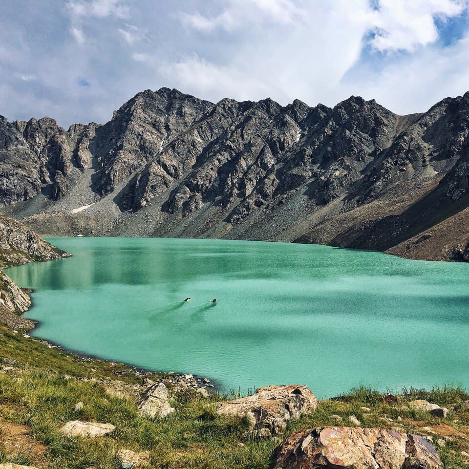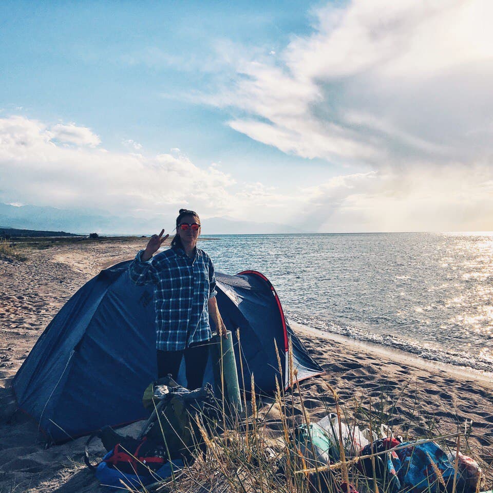 А мы переместились на другую стоянку, тоже на берегу моря-озера. Погода портится, озеро волнуется, прям как настоящее море, поднимаются волны и бьются о берег! Сегодня купались только самые смелые! Палатки поставили в высохшем устье реки, которая во время весеннего разлива впадает в озеро. Получился такой маленький уютный городок палаток. На берегу много сухих веток, поэтому был большооооой костер. Это наша крайняя ночёвка, завтра уже будем ночевать в хостеле в Бишкеке, со связью, телефонами и душем, в мягкой кроватке и на подушке — даже грустно как-то.