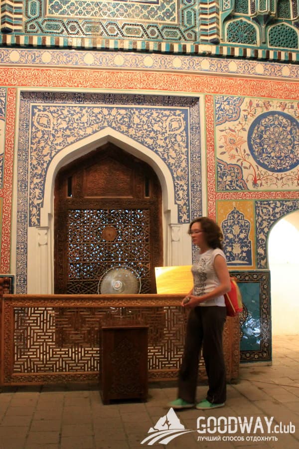 В его усыпальницу ведет дверь из дерева карагач (вяз), на ней очень красивая резьба 1404 года. Возле неё, в маленькой комнатке, можно посидеть на лавке и помолиться.